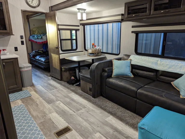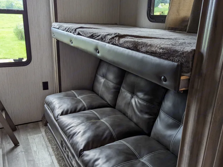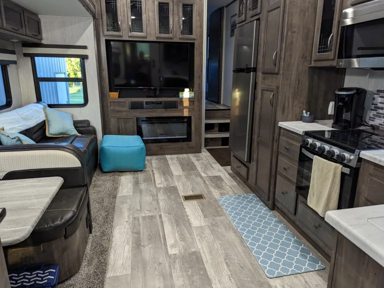 This is a brand new 2021 Sandpiper Fifth Wheel. It is a great family camper!! Featuring a queen-sized bed in the master, with a connecting full bath, which includes a shower. The master bedroom has its own TV, wardrobe and multiple drawers with great storage. The main living area is roomie, with a couch (folds out into queen bed), dinette (folds into bed) and 50in TV. The kitchen has a sink, stove, microwave, and full size refrigerator. The bunk room has a it's own TV with a couch (folds down to double bed), bunk and double bed loft. The bunk room also has it's own full bath, with a tub and direct access door from the outside. Tons of storage space underneath for all of your adventure gear with roll out storage rack.This rig is also jam-packed with extra perks! There is an outdoor refrigerator and surround sound capabilities. Main living and bunk room TVs have DVD players.What's included2x camp chairs, camping grill with propane tank, linens, cookware, dishes and utensils.Delivery and pickup within 50mi radius available upon request.Other things to noteNo pets.