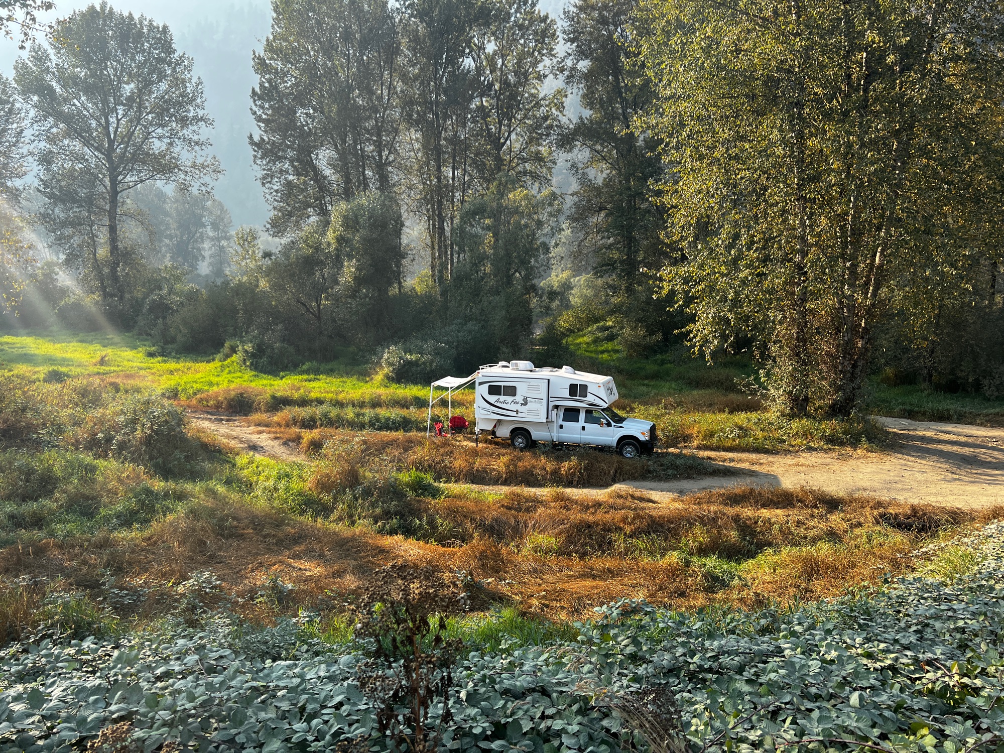 Enjoy a cup of French press coffee over the cool mountain air and the amazing views B.C. has to offer. Cozy up in the evening with a small overhead projector equipped with screen mirroring capability. Just Pre download your favorite movies or T.V shows and Netflix and chill, just add popcorn or your favourite treats. This also doubles as a good back up for those rainy days.let me introduce Hank Williams. He's a four-season Arctic fox camper Fully loaded with all the bells and whistles. This luxurious full sized truck camper comes with great amenities including a large electric slide giving you more space than you could ever imagine.
