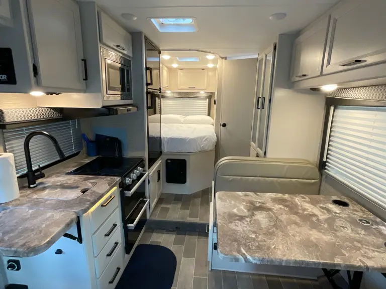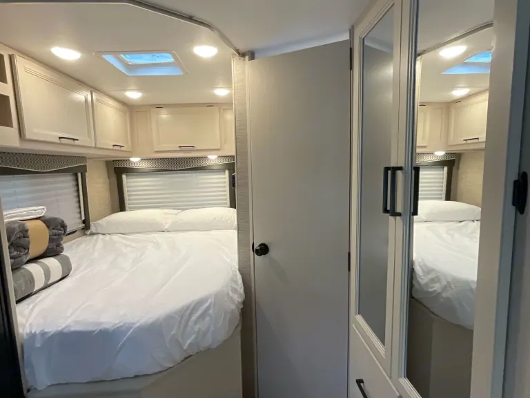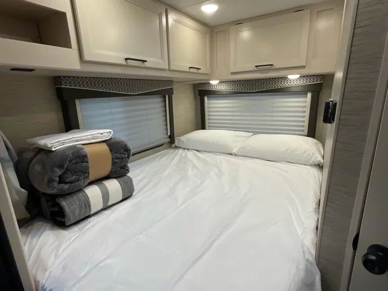 Discover freedom on wheels with the Ford Chassis V8 engine, automatic transmission, power steering, and cruise control. Side mirrors with bi-view mirrors for blind spot viewing. For your electrical needs a 4000-Watt generator and electric 30-amp inlet, with an additional 50-amp converter included with our rental. A roomy outdoor storage compartment for all your outdoor equipment can fit coolers, camping chairs, outdoor games, or luggage. Enjoy a shaded picnic outdoors with the powered Patio awning with LED lighting.Additional Features