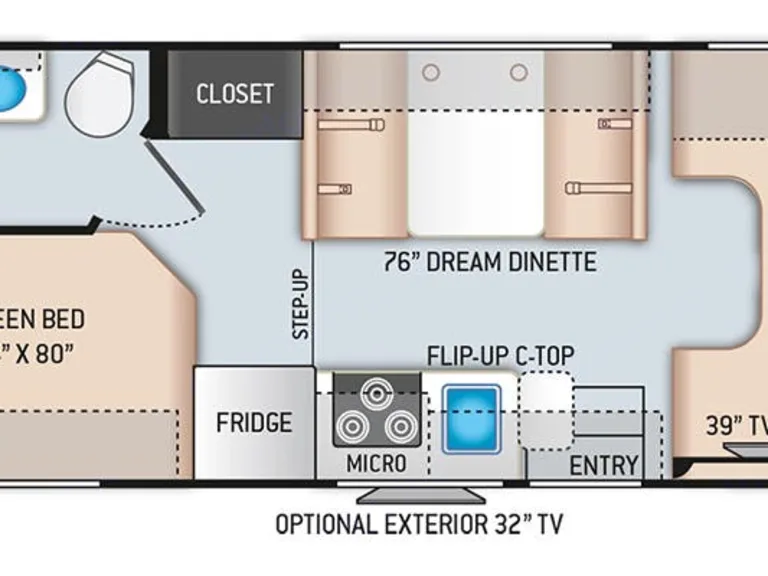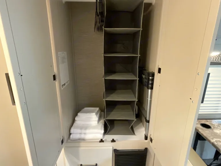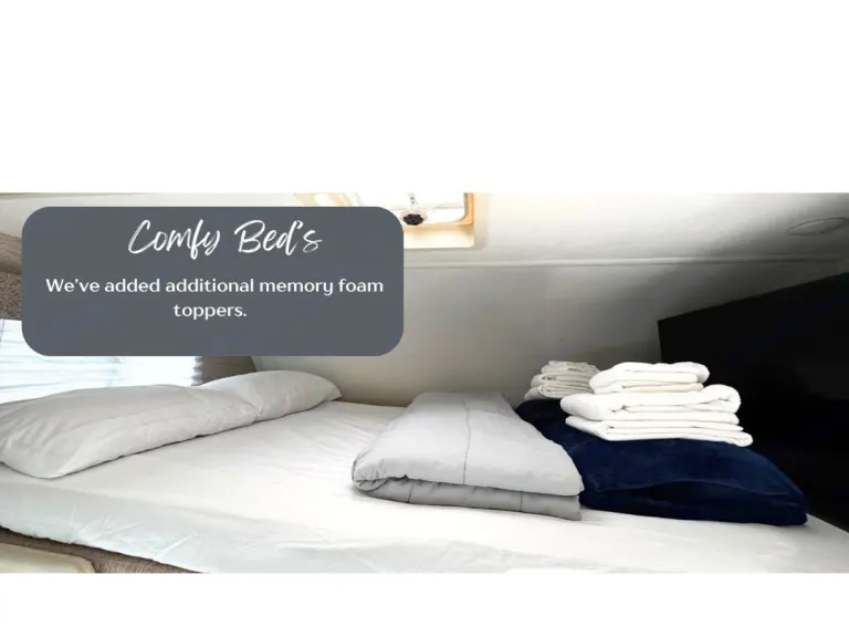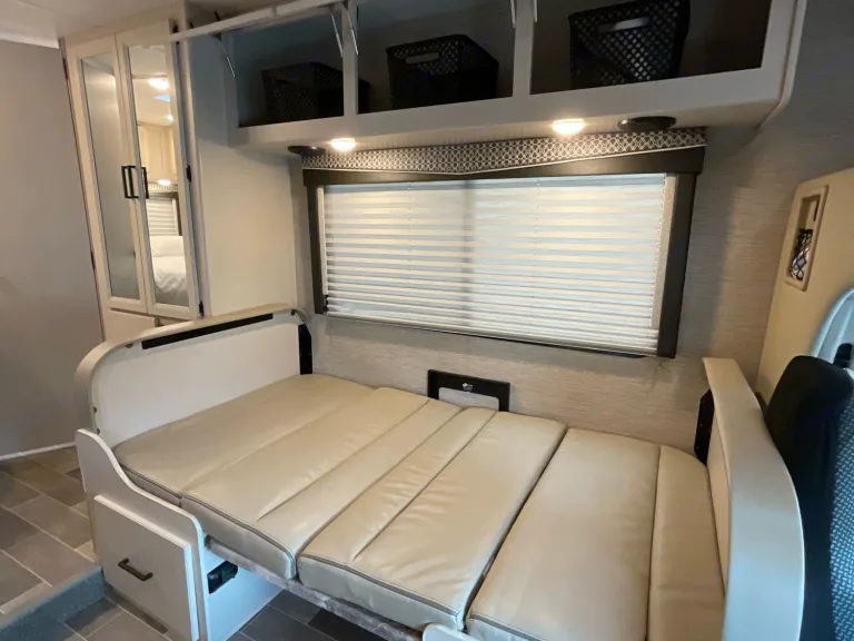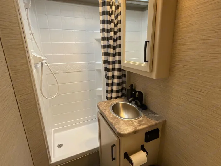 Your home away from home, sleeps 5 adults comfortably, two adults in the queen bed, two in the over-cab bunk, and one in the 48” x 68” convertible dinette bed. A queen bed (54” x 80” ), with an added memory foam topper for extra comfort. The upper cab bunk can sleep two adults (54” x 96”) and has a USB charging station with a net for easy access at night, cupholders, a privacy curtain, and a removable ladder. Mirrored storage closet with drawer below and a hanging rack to hang your clothes, hangers included.Bath