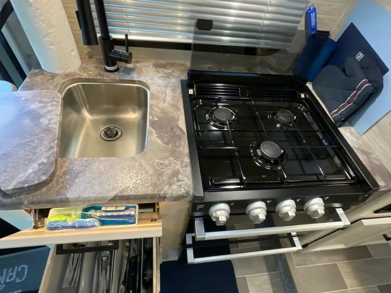 Unlock endless possibilities, as you create some tasty meals in your own personal kitchen, you'll find a recessed full-range three-burner gas cooktop, and microwave oven. The 12-volt refrigerator and freezer run off propane and electricity and has an automatic switchover. Stainless steel sink with sink cover and a pull-down sprayer with a flip-up countertop extension for extra counter space.Beds