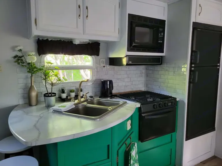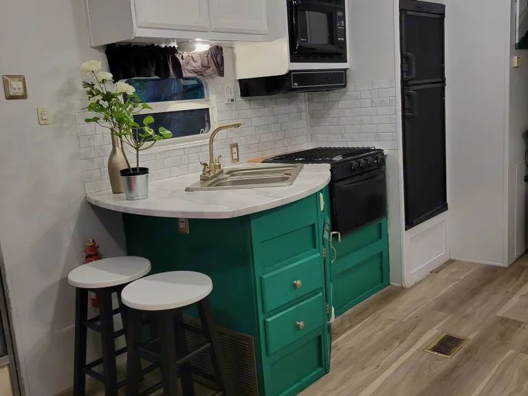 The countertop is remodelled to resemble marble stone that matches the kitchen table and vanity, with vibrant accents and colours that surround the propane oven/stove, microwave, and 3 way fridge/freezer. The 12ft slideout room has been upgraded with a house quality loveseat, bench seating with kitchen table and chairs, and an added coffee bar with a Keurig machine.