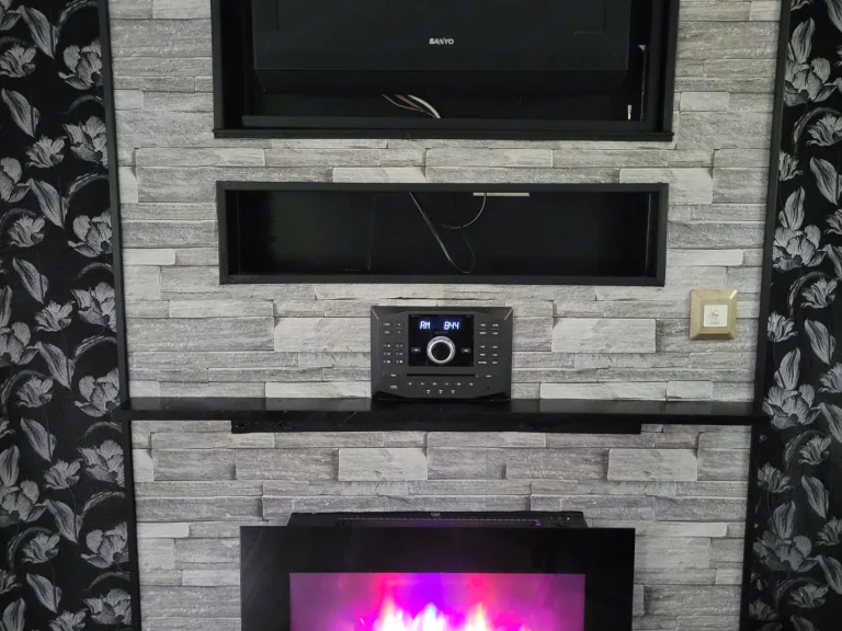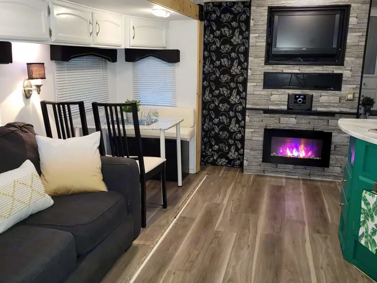 This Forest River Wildwood 35' travel trailer has been completely renovated from stem to stern, top to bottom! The main bedroom has been customized for our guests comfort, making them feel like their staying in an upscale hotel room. The queen sized bed is equipped with a 2" foam topper that looks and feels just comfy as your bed at home. The entertainment stand has been completely upgraded for modern day living. It harbours a newly installed, multi-colored electric fireplace that can be used to warm up the space or to create a vibrant ambiance. The new Jenson stereo system bolsters Bluetooth capability that pairs wirelessly with your personal devices, as well as plays AM/FM/DVD/CD and USB that connects to a HD, swivel TV.