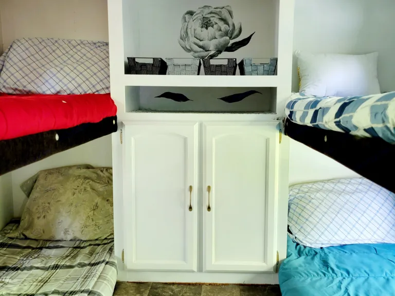 The brightly painted bathroom has outside access, a full bath, and upgraded shower head that delivers excellent water pressure! The 4 bunkbeds at the backend of the RV each have a foam topper for comfort, a central charging outlet, and an individual bunk basket to keep small personnel belongings close by. Every square foot looks and feels bright and spacious!