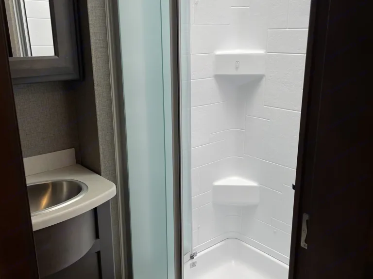 The bathroom is spacious and has a shower large enough to comfortably shower in.