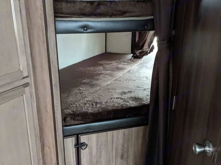 Inside an RV rental: view of cozy bunk beds with dark privacy curtains and a window. Ideal sleeping area for a family camper.. Jayco Jay Feather 2019