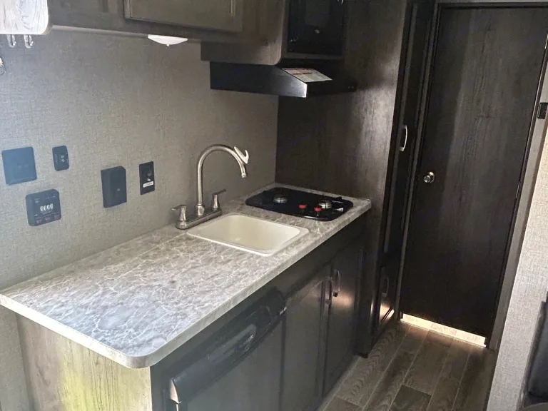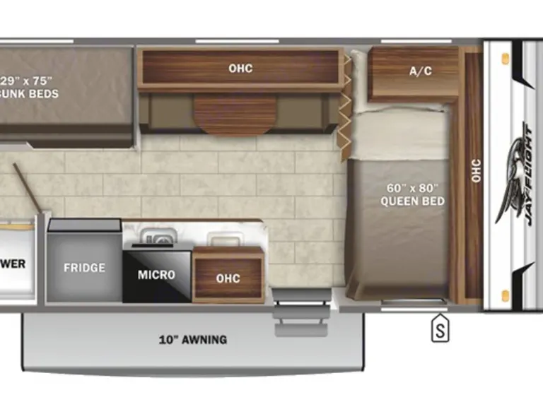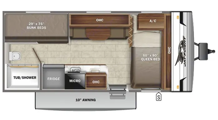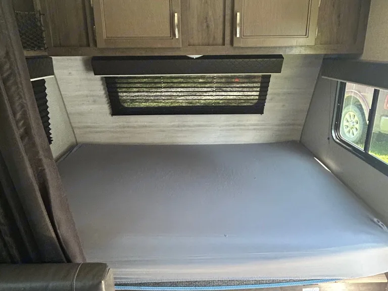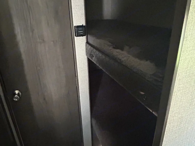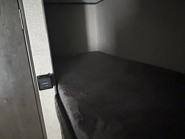 RV rental interior: door, thermostat, and dark bunk beds. Compact sleeping area in a travel trailer.. Jayco Jay Flight SLX 2021
