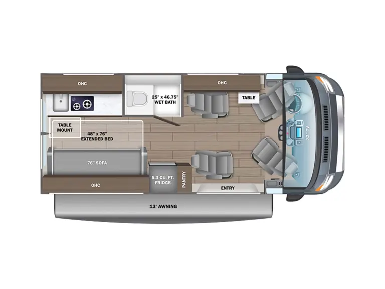 Rear lounge sofa converts into a 48” x 76” bed (sleeps 2 adults or 1 adult & 2 children).