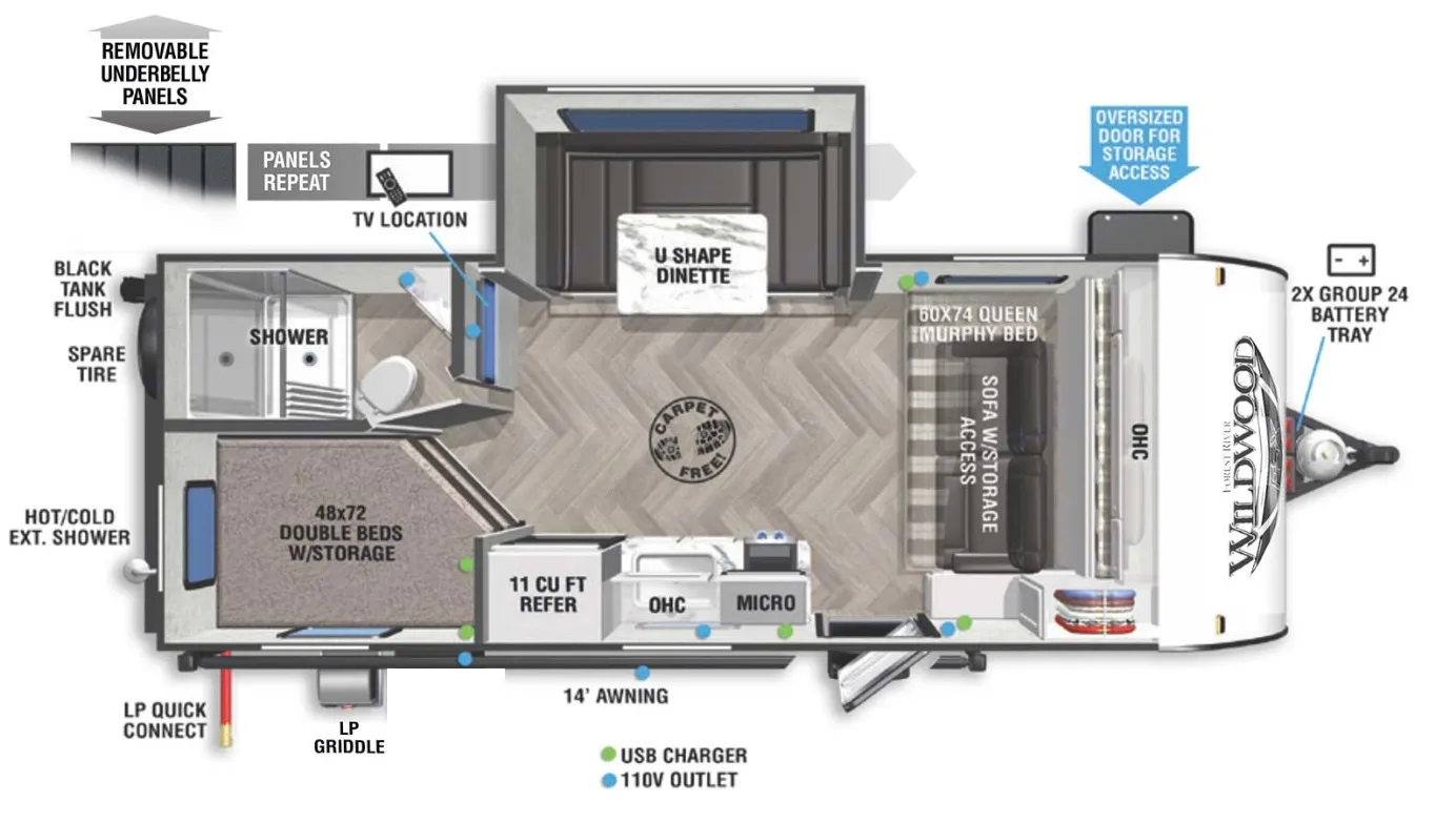 I love my Pearly Baker best, more than my wine! Pearly is a gently used, well maintained 2021 Forest River Wildwood FSX Platinum 178Bhskx with some improvements. This nearly new travel trailer is perfect for a outdoor retreat.Pearly will be cleaned and stocked with some additional basic amenities such as kitchenware, pots and pans, plates and cups, bed linens, towels, toilet paper, outdoor chairs, folding table, small coffee maker, Roku TV, DVD player, waterproof Bluetooth Speaker with FM band stereo, mini Karaoke Machine and more! All this in addition to the basic supplies needed for power, water and sewer hook ups.Pearly doesn't include a generator, so if your planning on dry camping or boon-docking, consider bringing your own, or renting a gas or solar generator. The provided 12v house battery will charge when connected to your tow vehicle or shore power and is sufficient to operate the led lighting, powered tongue jack, slide and awnings for a short period of time. This battery will not provide sufficient power for an overnight trip.Additional Features and Details;