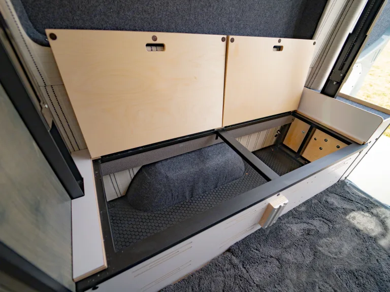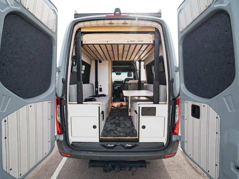 Voyager is a brand new 2022 Mercedes Sprinter van. Enjoy comfort and maneuverability, without the hassle of a larger rig. Voyager is highlighted by the 2 extra seats with seatbelts (these seats fold up out of the way) and 2 full sized beds (one is on an automatic bedlift that lifts out of the way and another coverts from the back benches) that makes trips with 4 people possible. Voyager is also 4x4 so no worrying about getting stuck. Voyager also comes equipped with air conditioning, heating, a microwave, heated water, a sink and a shower to make your adventure as comfortable as possible. And no need to worry about running out of power. Voyager has solar and an inverter so you never have to go to a noisy RV park to plug in!