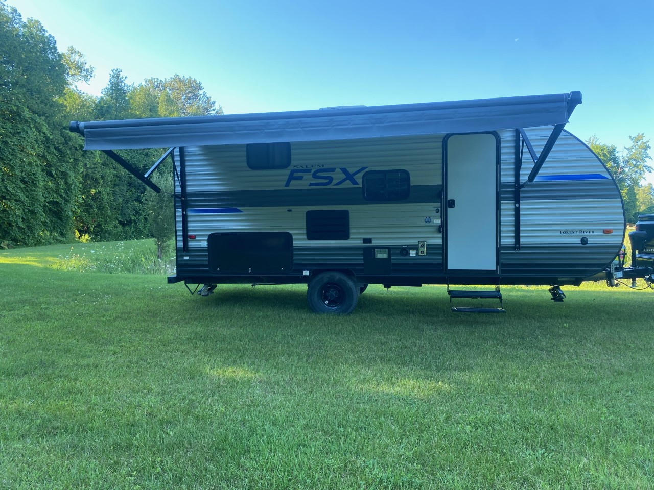 Welcome to salem trailer a gently used 2021 salem fsx 19ft travel trailer. Rental is to be towed behind a SUV or pickup truck with towing capacity of 4000lbs delivery is available for an extra fee. Sleeps 4 adults and 2 children comfortably. Comes with fitted sheets for all beds must bring your own blankets and pillows, wash cloths and dish cloths provided as wells as dish soap and hand soap for kitchen and bathroom. All utensils included (forks, spoons, knifes, plates, bowls, cups, coffee mugs, pot and pan) 2 fridges one inside and one outside. 4 camping chairs provided as well as mat for outside, 2 small side tables. All power cords and water hoses provided. Can also rent 2 kayaks with paddles, life jackets and safety kits.