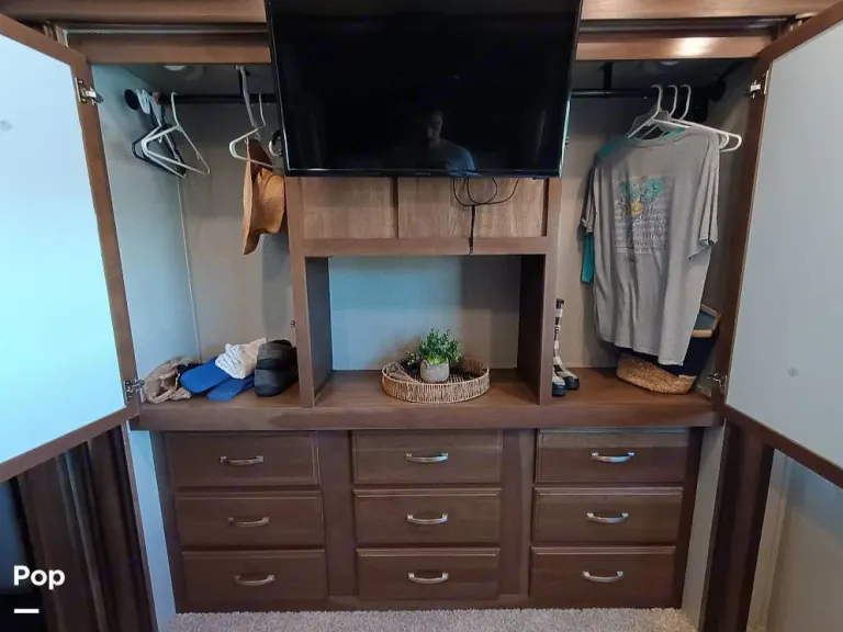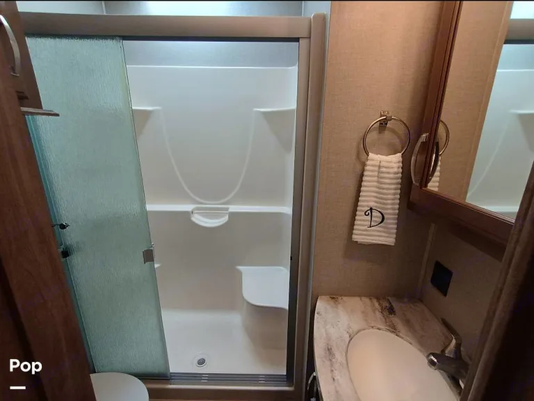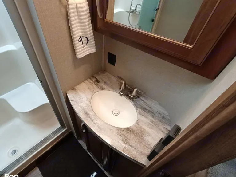High-end fixtures and storage for toiletries and towels.Exterior:Large power awning with LED lights for outdoor lounging.