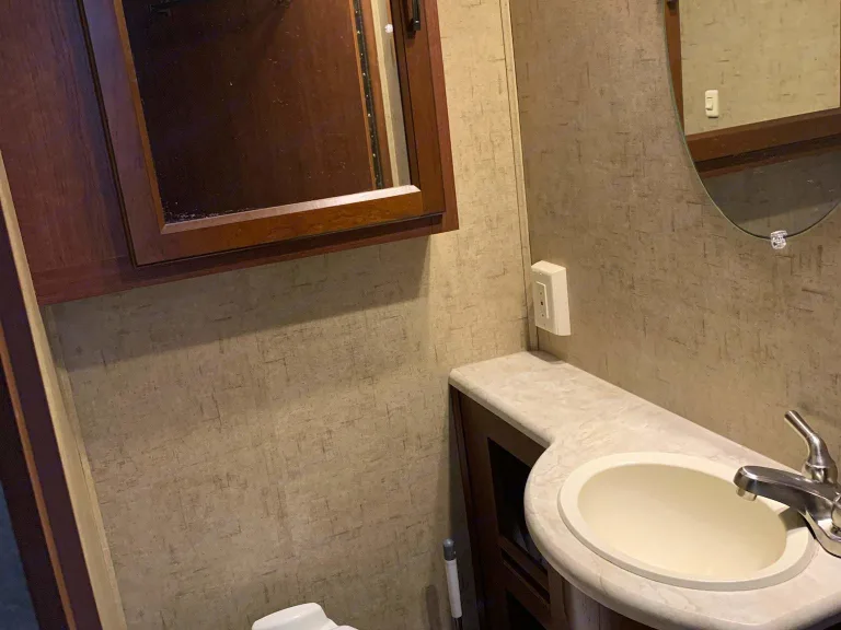 When setting up, look for the most level spot for the RV. Place the orange level from the drivers door pocket on the RV floor to level the RV from front/back and side/side. There are several yellow plastic levelers in the left side compartment. Make sure the parking brake is on and the engine is off when putting the slide-outs in/out. The refrigerator is dual mode, propane gas or electric, and pushing the auto button will allow the system to determine the source of power.