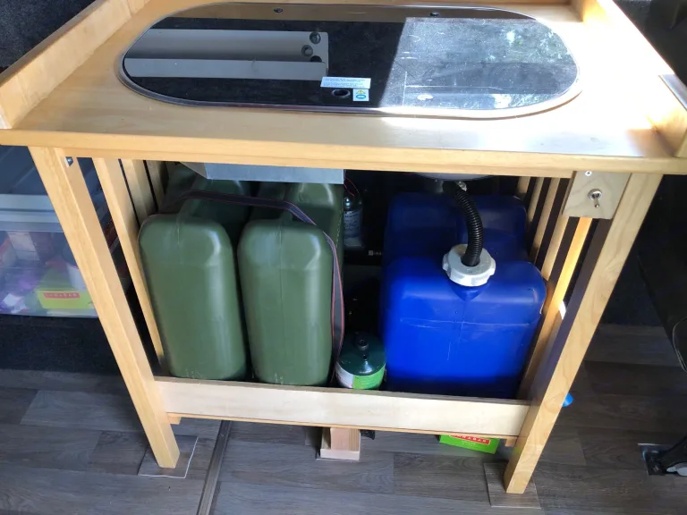 -10 gallon roof mounted Road Shower. Heated by the sun, and pressurized by a 12v compressor. This gives you an outdoor shower, a dish wash station, bike wash, etc.