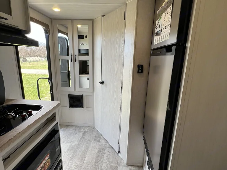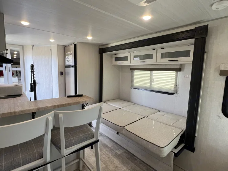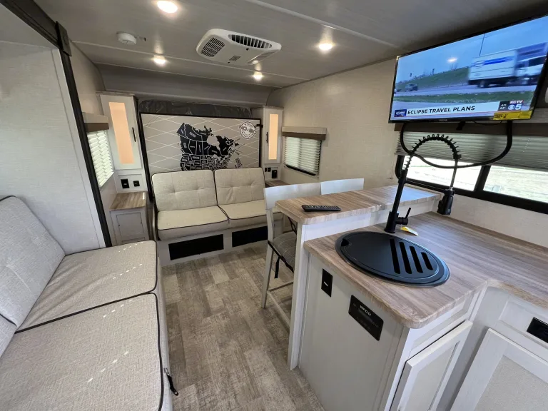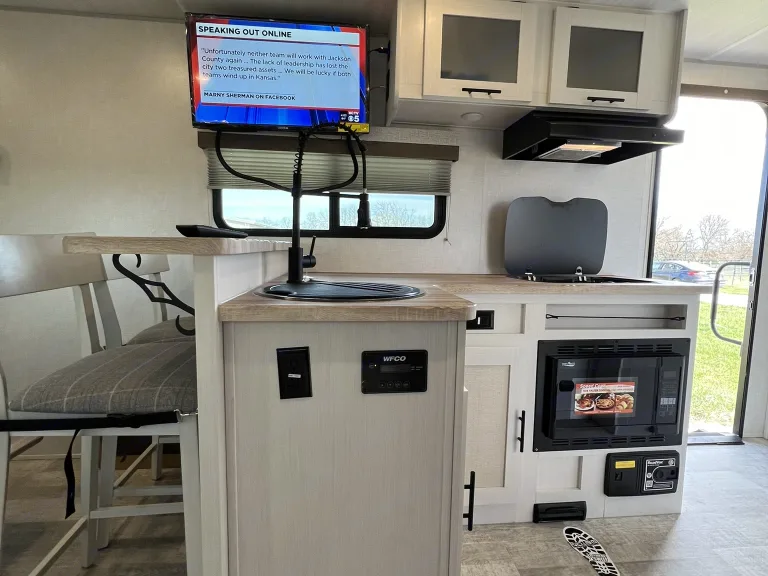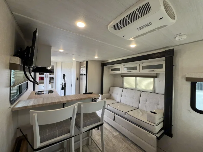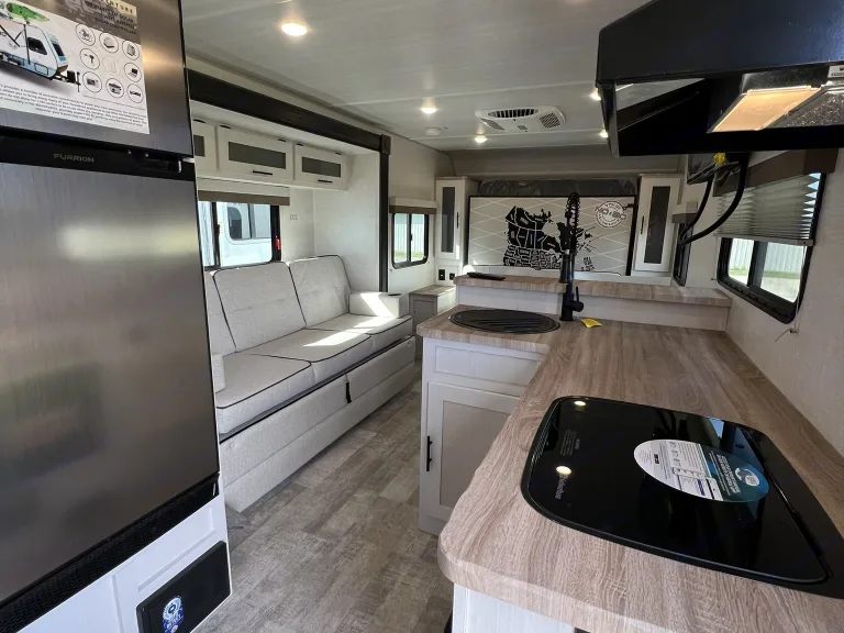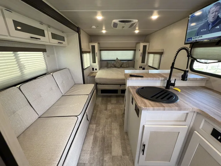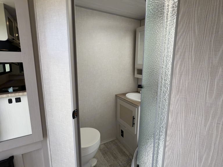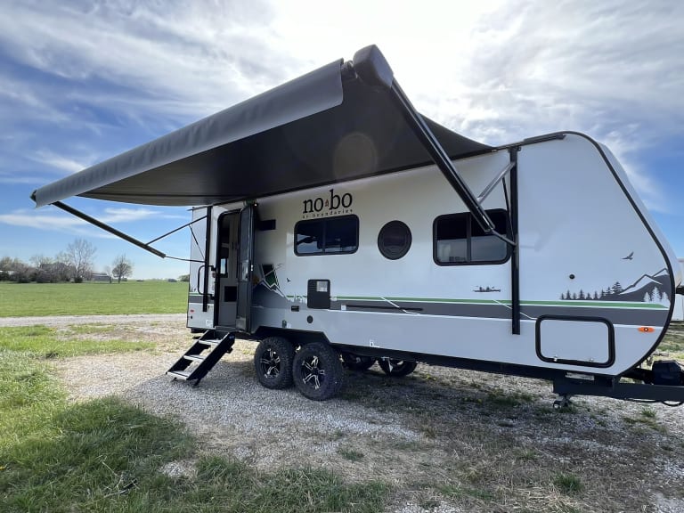 Happy Trails - A Versatile Travel Trailer for Adventurous Getaways & Special Events!Welcome to your all-in-one solution for outdoor adventures and special occasions! Explore the great outdoors without sacrificing comfort on or off the grid. A weekend getaway or extended road trip – this trailer has everything you need for a memorable adventure.Also perfect as a guest suite for special events like rural weddings and tailgating or as a home-away-from-home at sports tournaments, horse shows - any outdoor activity you enjoy!And yes, pets are welcome!The Happy Trails trailer offers a spacious interior with a comfortable queen-size Murphy bed and the convertible 6’ sofa in the slide out offers ample additional sleeping space. The two seat breakfast bar also adds extra seating space to the interior.There is a TV to enjoy during your down time or for keeping any eye on that crucial game while you're taking in the natural surroundings. The electrically powered awning keeps you and yours out of the hot sun, but still having fun. Abundant USB ports and outlets keep your electronics charged and working while you're out and about in the wonders of nature.The Interior Kitchen includes a refrigerator, convection microwave, stove and sink. Or if you prefer, show off your griddle skills in the Outdoor Kitchen which also includes a prep table.This trailer includes the Curt Beast Mode package. Rugged tires and independent suspension mean Happy Trails can handle diverse terrains making it perfect for outdoor events and rural settings! The Solar package means you can stay off grid and enjoy sustainable power wherever your journey takes you. The 2000 watt inverter will run virtually all amenities! *The Rhino Rack on the roof makes transporting your outdoor equipment a breeze to whatever location you may want to explore.Most importantly, the Happy Trails trailer is equipped with a bathroom, full-sized corner shower, air conditioning, heating, storage space, a central vacuum system and a propane tank for your convenience. Fabrics are easily wiped down and there is a high-pressure hose for washing down equipment, pets and more. Pleated shades are installed on all windows for privacy when you want it.* solar cannot power AC off grid, but will run all other appliances.What's includedIncluded Amenities: