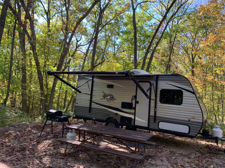 - Cleaning supplies - Dish soap, sponges, hand soap, broom, vacuum, etc.Bathroom has a toilet and separate tub/shower. RV grade toilet paper included.Camper includes mattress protectors, sheets, and a pillow/pillowcase for each bed. Bring your own blanket/sleeping bag or choose as an add-on.Dog friendly rental - Dog cleaning fee will apply!Generator available for an additional cost for your boon-docking pleasure! RecommendationsOne of our favorite local campsites is Blue Mounds State Park. Great hiking, private wooded sites, and even a pool/splash pad for an extra cost. Other things to noteAnti sway hitch included with camper for safer towing. As long as you have a regular hitch receiver our hitch should be compatible.This camper has electronic brakes. A brake controller is required to tow the camper. Many vehicles are equipped with brake controllers, or they can be added on to the vehicle. We do have a wireless brake controller available, but it is preferred to have some sort of built in option.7 Pin plug required to tow camper.
