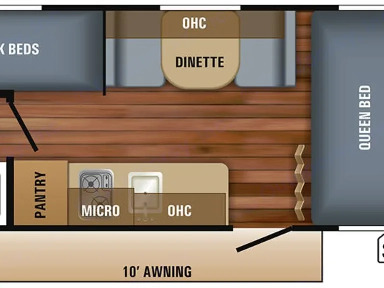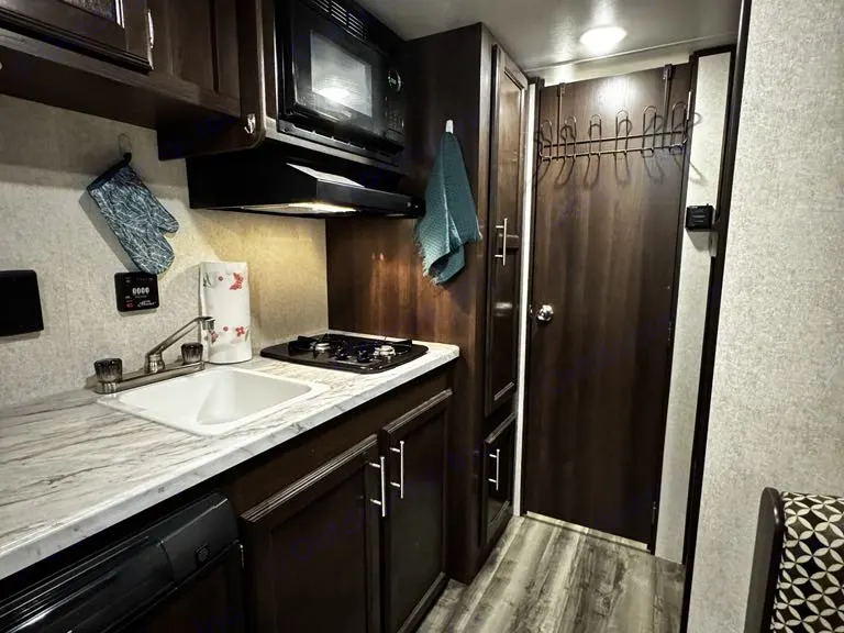 Compact camper with space to sleep up to 5 people. Queen upgraded memory foam bed and two twin bunks allow for 4 people. The 2-seater dinette also folds down to make a twin bed. Kitchen comes stocked with dishes, cookware, utensils and silverware, coffee maker and toaster. The bathroom has towels and washcloths. Fully stocked with linens, blankets and pillows, you only need to bring your clothes and food. There is a small fridge with a freezer box inside. Let us deliver this little gem you your campsite or even private residence for family reunions. What's included•5 cup coffee maker