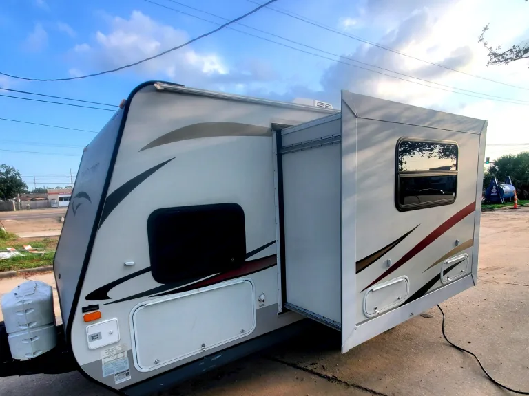 If you are looking for a small, but mighty portable structure for two adults, four adults, or two adults and two kids then look no further. It is equipped with ,outdoor shower, awning, gas connection for outdoor grill, TV, DVD, and Radio with indoor/outdoor speakers, dining table, refrigerator, gas stove, oven and microwave. The refrigerator and water heater can run off either gas or electric with automatic switch over. One day notice is needed for pick-up, two day notice needed for delivery. Other things to noteCopper loves pets, but no smoking please he has allergies. Also please refrain from taking your party to the roof. A one day notice is needed for pick-up, and two day notice for delivery.