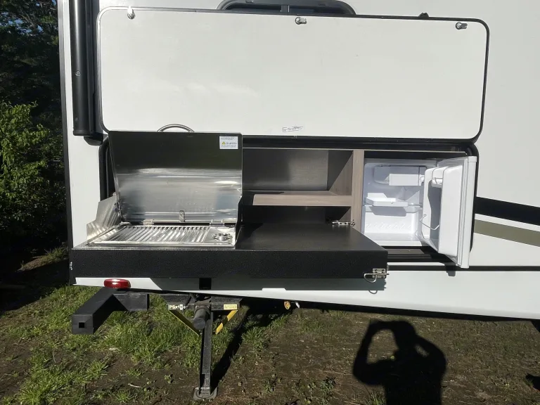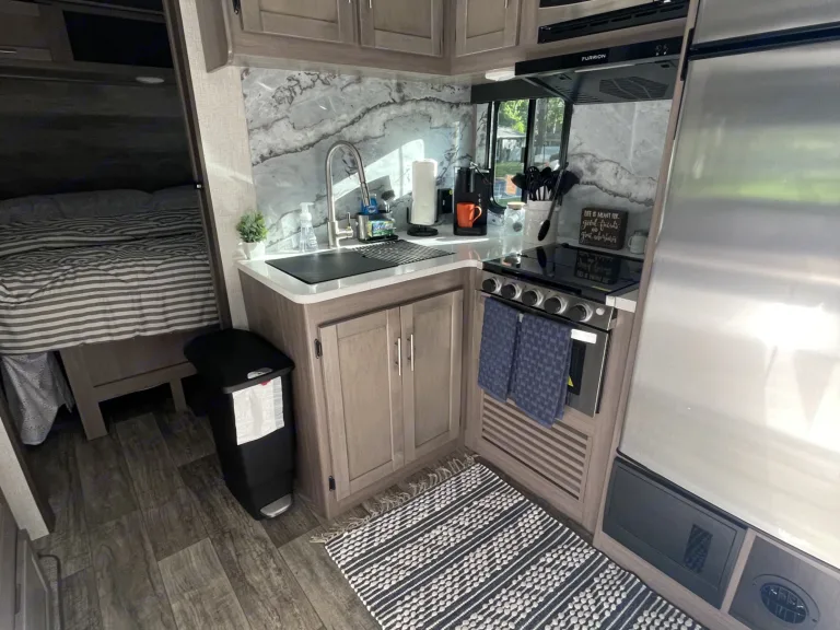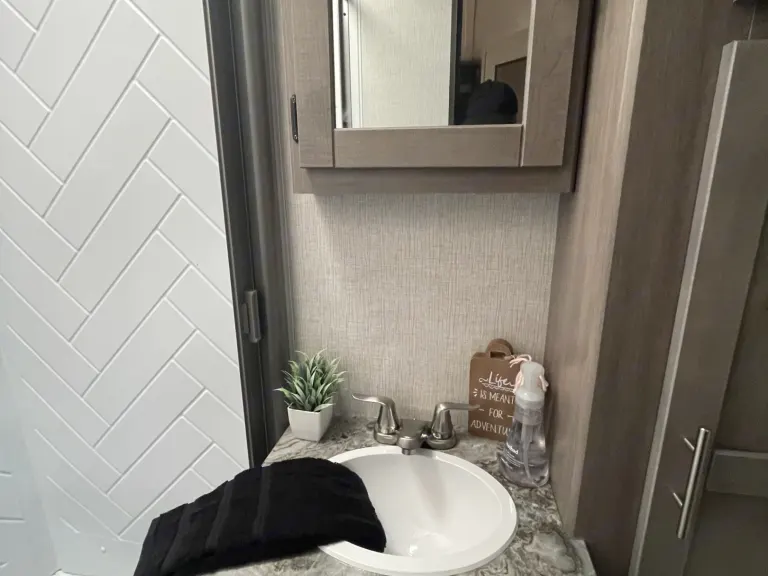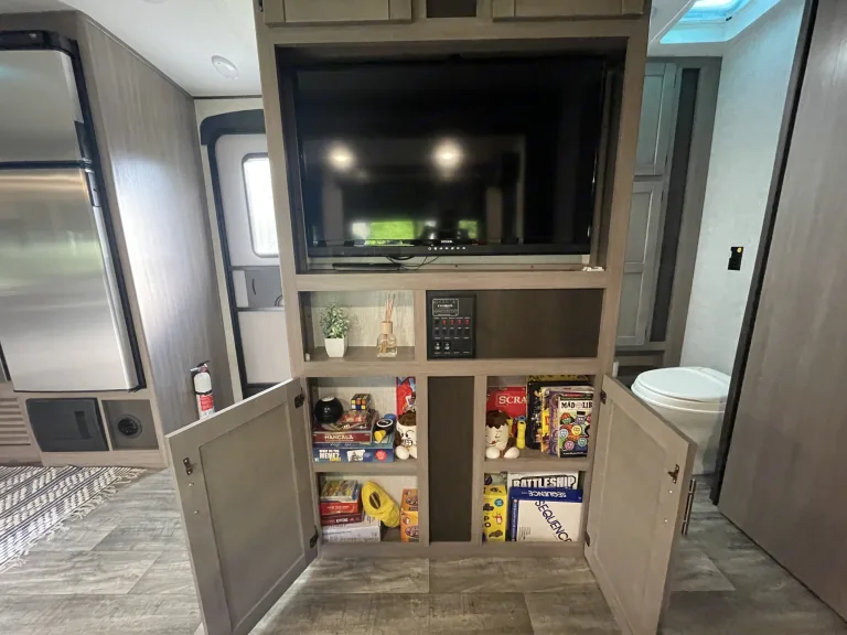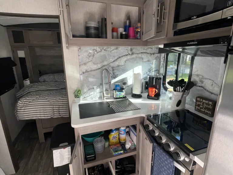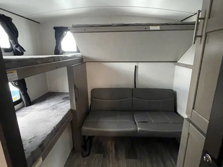 What a great camper. I think it may be the best layout we have been in so far. Both the master and bunk rooms have closable doors and plenty of space in the middle. Oh and a full sized pantry. What makes this rental even better is the care you can clearly see. It was perfectly clean, they supplied linens, even small decor around the trailer. Really made it feel like home. Everything we might have needed was in there. They delivered the trailer to the site on time. Had zero issues. Definitely will be renting again.