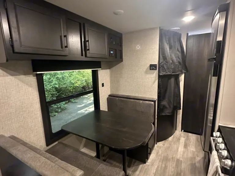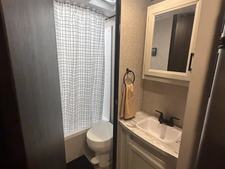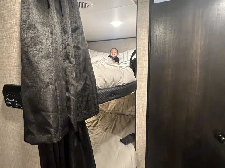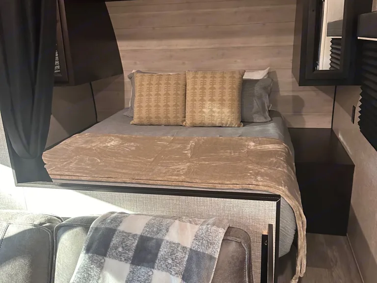 Our camper can accommodate up to 8 people, making it ideal for families or those who enjoy camping with friends. The main bedroom has a queen size bed. Bunkhouse is equipped with two full size beds and can easily sleep four depending on the size (each holds up to 600lbs). Couch turns into bed as well dining table. Bath/shower combo as well as outdoor shower to rinse off any unwanted dirt before coming in. Has all equipment for full hook ups to include fresh water hose with water filter, electrical hook up, and sewage hook up. Awning has LED lights with outdoor TV mount for outside entertainments. What's includedMaster bed, bunkhouse, extra blankets. Fresh kitchen and bath towels. Dinner wear included for 4 people, coffee pot, 1 mounted TV that can be moved outside for outdoor entertainment. 2 camping chairs, 10 leveling blocks, 2 wheel chocks, 1 cordless drill for speedy stabilizer.Other things to notePets welcome, absolutely NO smoking, festivals will be approved on case to case basis. Tank dumping will be a $25 charge if not done prior to return.