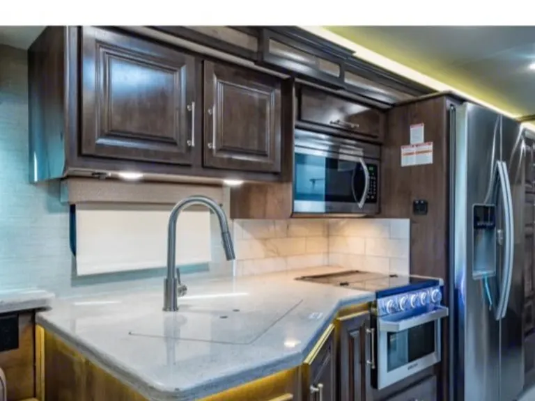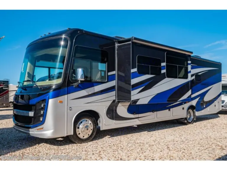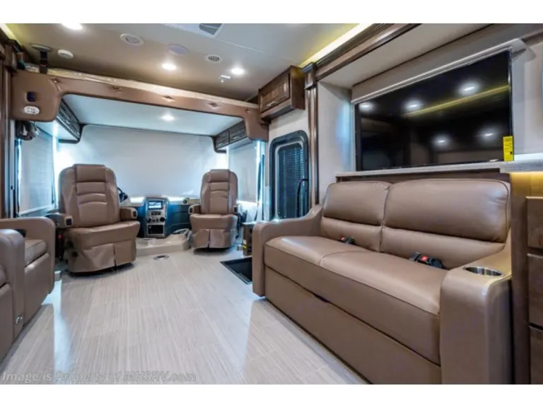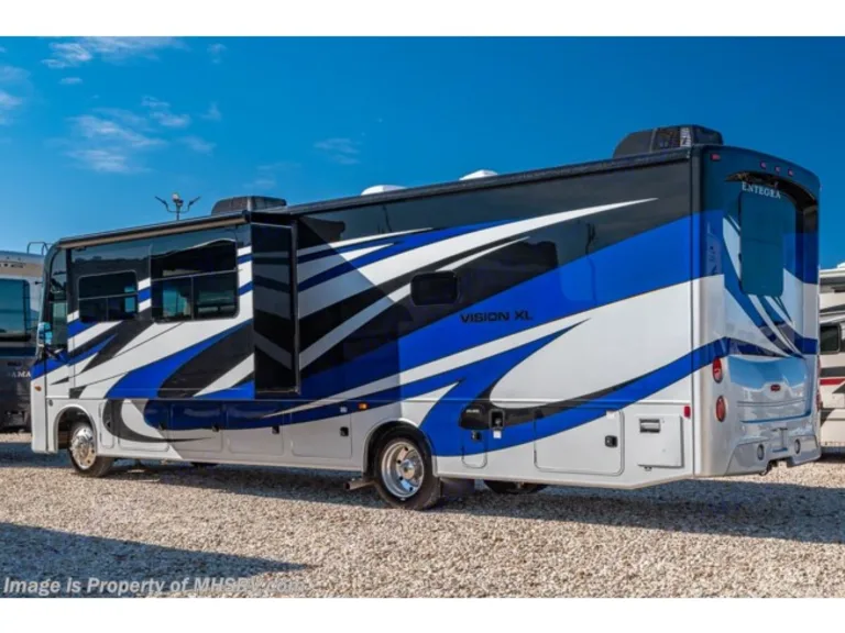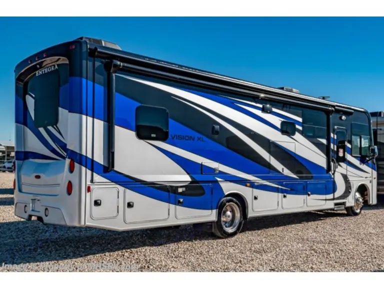 What a fun time you'll have exploring, socializing, and venturing out to new destinations in this Vision XL Class A gas motorhome! There is plenty of space on the interior to spread out and relax with the full-wall slide and the opposing slide in the living area, and you will be able to invite friends in to hang out since you can offer them seating on the 42" x 70" booth dinette, 60" theater sofa, and 60" tri-fold sofa. Play a group game, or put on the football game with the 50" LED Smart TV. After you've entertained everyone, you can retire to your own RV king bed back in the private bedroom. And you can even invite your friends to stay the night if you want because the dinette and sofa will provide some extra sleeping space.Trips have never been easier to plan than with the Entegra Coach Vision XL Class A gas motorhome! Since the Vision XL comes with just about anything you could need while you're out and away, you'll always feel like you're right at home. These coaches have been expertly crafted with the E-Z Drive Elite package, so you can experience the smoothest ride, and the construction is absolutely reliable with its TuffShell vacuum-bond laminated sidewalls and floor, bead-foam insulation, one-piece, seamless crowned fiberglass roof, and fiberglass exterior walls. Before you take off, pack up the lockable pass-through storage compartments with your totes and travel gear, and then head to the cockpit where you can use the backup and sideview cameras to maneuver easily out of the driveway. The kitchen is both attractive and useful with its LED-lit, solid-surface countertops, decorative backsplash, and recessed stainless steel sink, and the water filtration system will make it easy to stay hydrated.