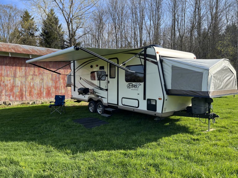 Spacious and comfortable hybrid travel trailer. 3 queen sized beds that pop out! Full bathroom, fully stocked kitchen. Go camping in style!What's includedWill provide sheets. Pillows, blankets, towels and camp chairs not included.