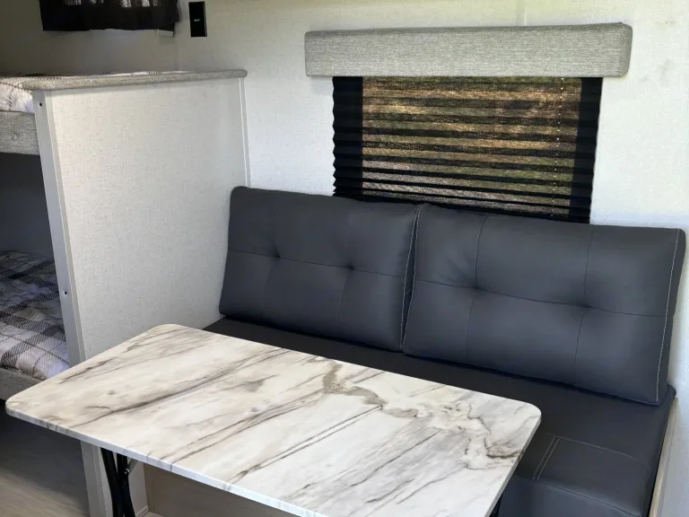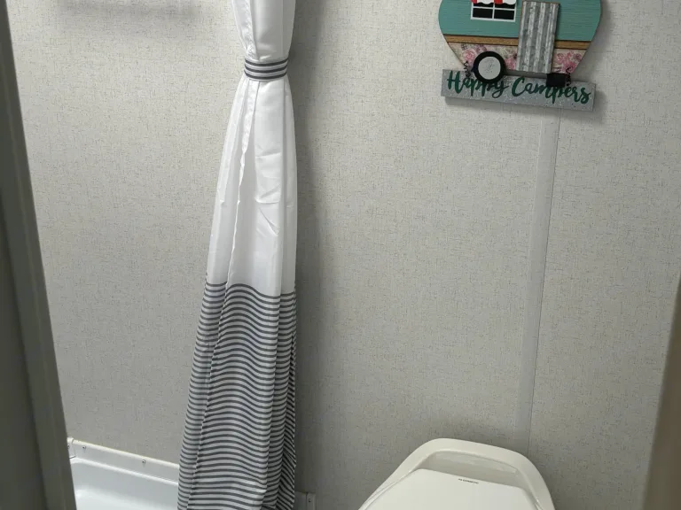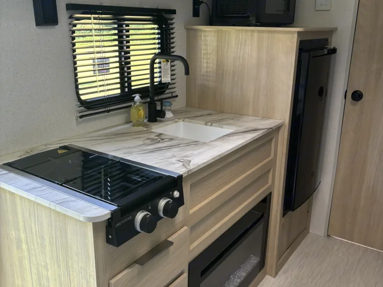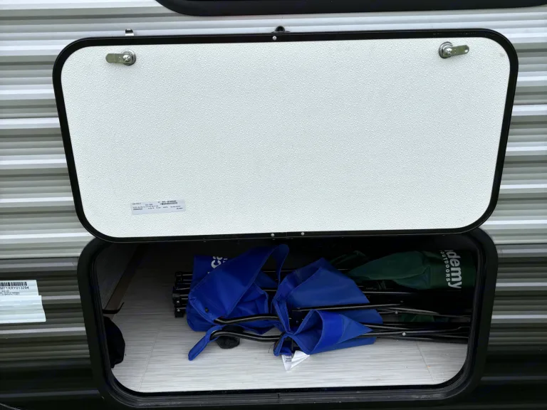 • Keurig Coffee PotOther things to noteRequires a trailer hitch with a 2” ball. We do not provide a receiving hitch or brake controller. Spare tire, power cord and adapter, leveling jack rod, and bag chairs are located in exterior storage compartment. Gray and black water dump hose located inside rear bumper.
