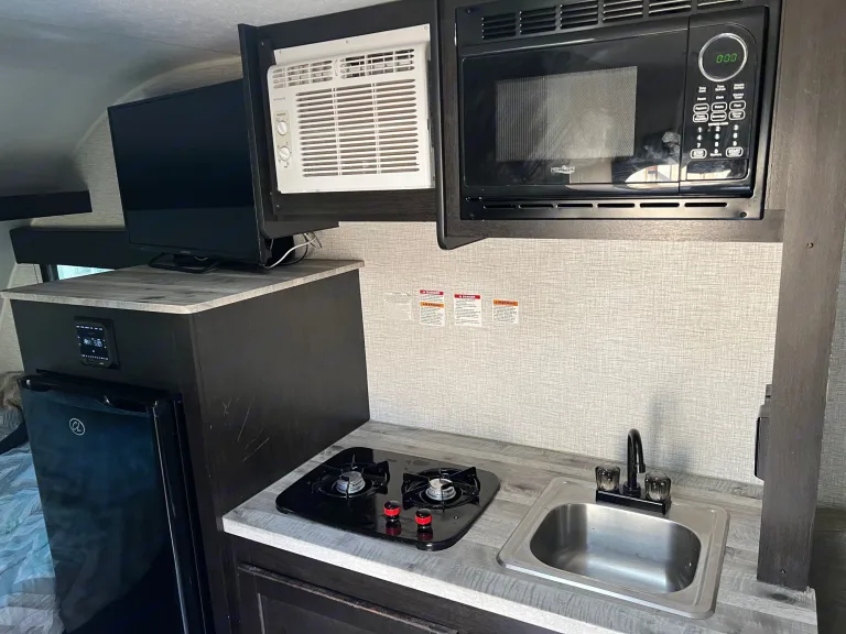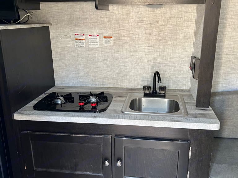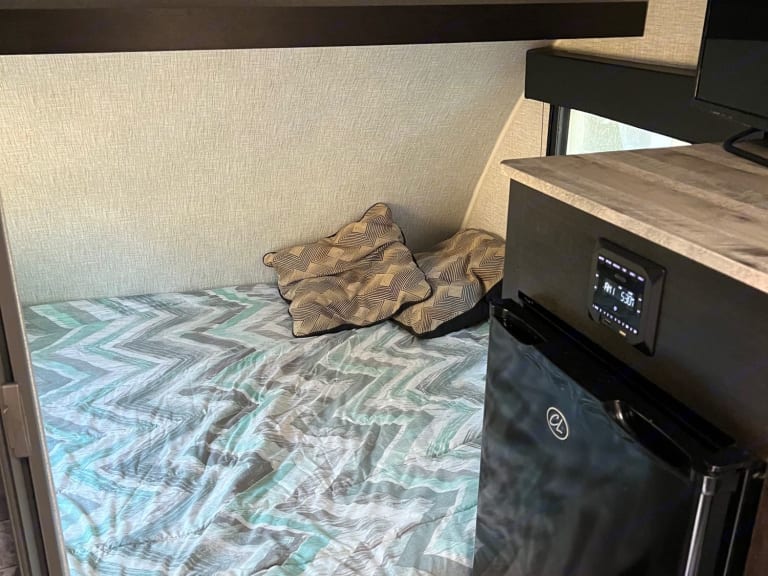 Are you ready for a fun camping adventure in this Free Solo Plus teardrop trailer?Book with us and book it out of here!This cozy trailer will allow you to cook healthy meals during your stay. You'll be able to use the two-burner cooktop and microwave to create delicious meals, and the 12 volt refrigerator can keep some soft drinks cool for later on.After your afternoon of outside fun, you'll definitely want to come back inside and rinse off in the wet bath.Once nighttime comes, the queen-size bed and booth dinette will provide sleeping space for yourself and three other tired campers.The 12V high-output attic fan is also a great addition that will allow you to bring in a cool fresh outdoor breeze.Pets welcomed. No smoking please.