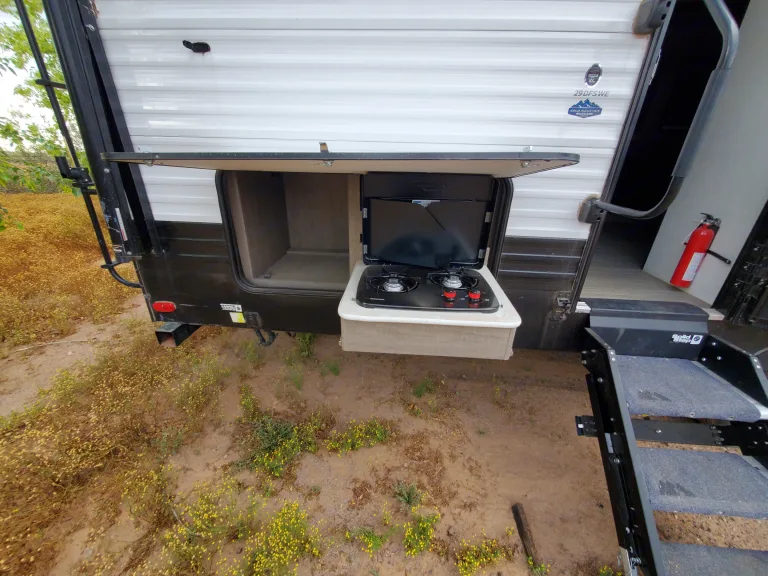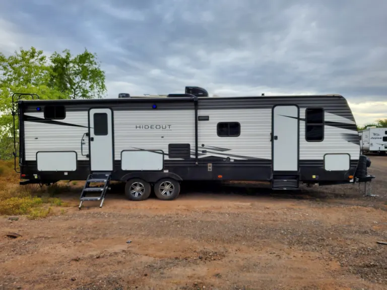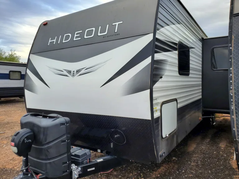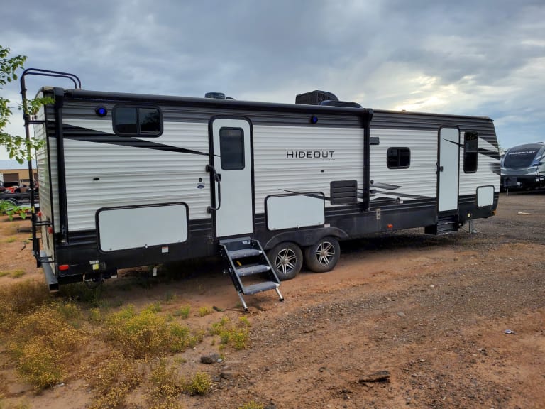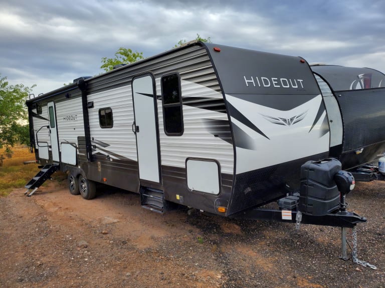 2021 Keystone hideout 29dfs. This is a 31 ft floor plan around 7100 lb dry. Can be towed with a newer half ton truck or suv. Very desirable floor plan with spacious layout. Deducted AC and heat furnace. Two entrance doors 20 ft Electric awning. Indoor and outdoor electric fireplace. Indoor and outdoor kitchen and cooktop. Bluetooth stereo indoor outdoor speakers. Large 32-in smart tv. DVD player and he'll say hand me. Electric jacks. Trailer sleeps up to 10. Arctic package with insulated underbelly. Damage deposit required. Weight distribution hitch and Generator available. Three night minimum requirement. Holiday rates and special event pricing may very.