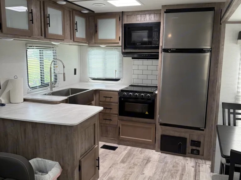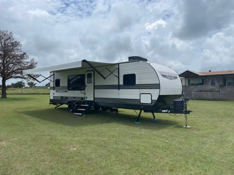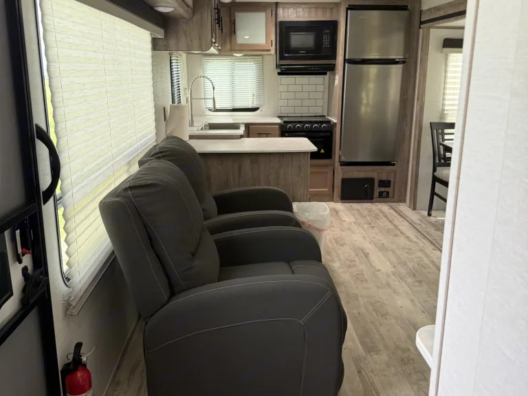 This is a brand new 2024 Kingsport travel trailer. It is designed for comfort in mind. It features 2 recliners and also a dinette for all of your meals. It also features a fold out sofa for your extra guest. As you walk thru this travel trailer the space speaks for itself. The bathroom is well equipped with shower and sink with ample amount of space for all your needs. The bedroom even though it is a queen bed gives you plenty of room for rest and relaxation. The comfort carries on to the outside with an awning for sunny times during the day and also speakers to enjoy your radio.What's included• kitchen utensils