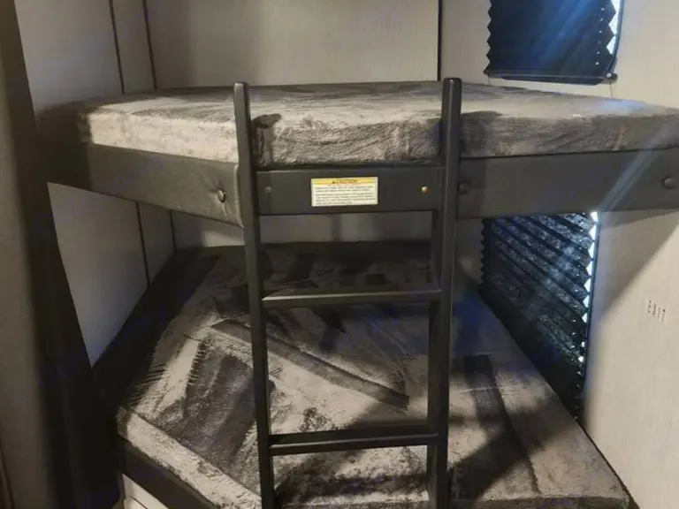Unwind in the master bedroom featuring a luxurious queen-sized bed, ample storage, and a private entry to the bathroom. The cozy bunkhouse is perfect for the kids or additional guests, offering their own comfortable space.Spa-Like Bath: