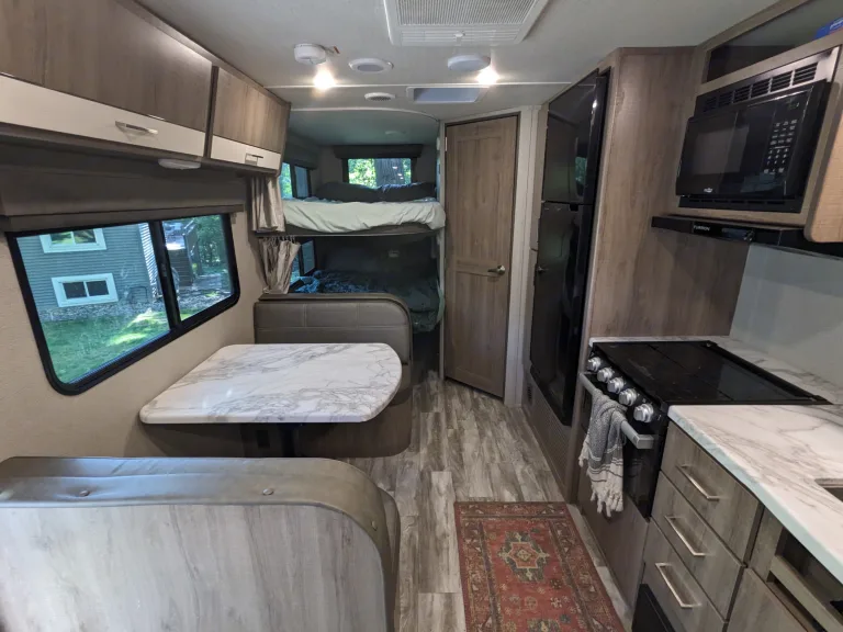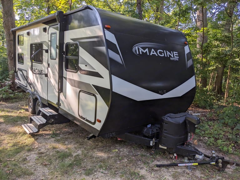 This clean and light camper trailer packs a punch. With a GVW of 6,395 lbs., it can be towed by mid-size vehicles. Grand Design's website claims it can sleep 7-8, but realistically, it can sleep 5 adults comfortably.The thoughtful design and quality construction make for effortless functionality and unique storage. It's also 4-season rated with insulated walls, ceilings, and floor, so winter camping is available.We lovingly care for this camper and keep it very clean and stocked with all the necessities. We believe nice furnishings add to its comfort, but we are careful not to leave it feeling cluttered.This camper is stored at our house, and we can assist with hookup. We will make instructional videos available to renters so you are well informed on how to set up at camp and operate all of its features.See the manufacturer's website for additional specifications by searching "Grand Design Imagine XLS 21BHE"What's includedFresh linens, beach/bath towels, a coffee pot, 3 camp chairs, an area rug, a folding table, a hammock, a pet tieout, cooking utensils, cutlery, and dishware will be included.RecommendationsThis camper fits all electric state part sites and most national park sites. We have found many great private campgrounds as well as county parks. With a smaller footprint and intelligent layout, this camper is both versatile and functional.Other things to noteWell-behaved pets are welcome