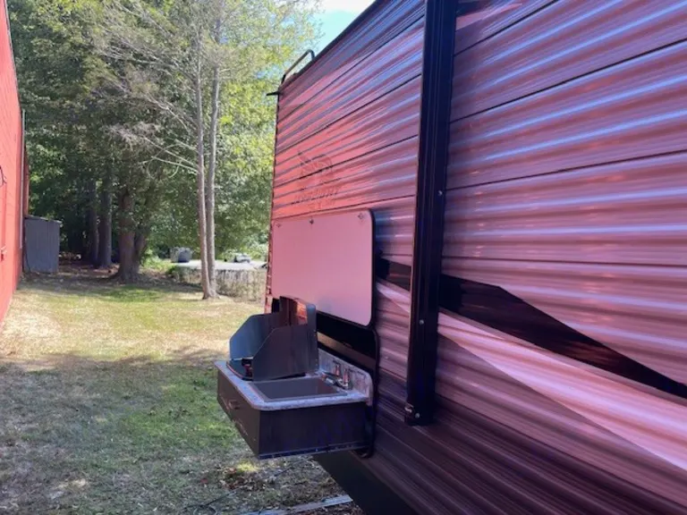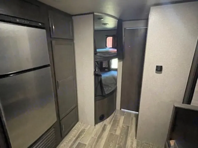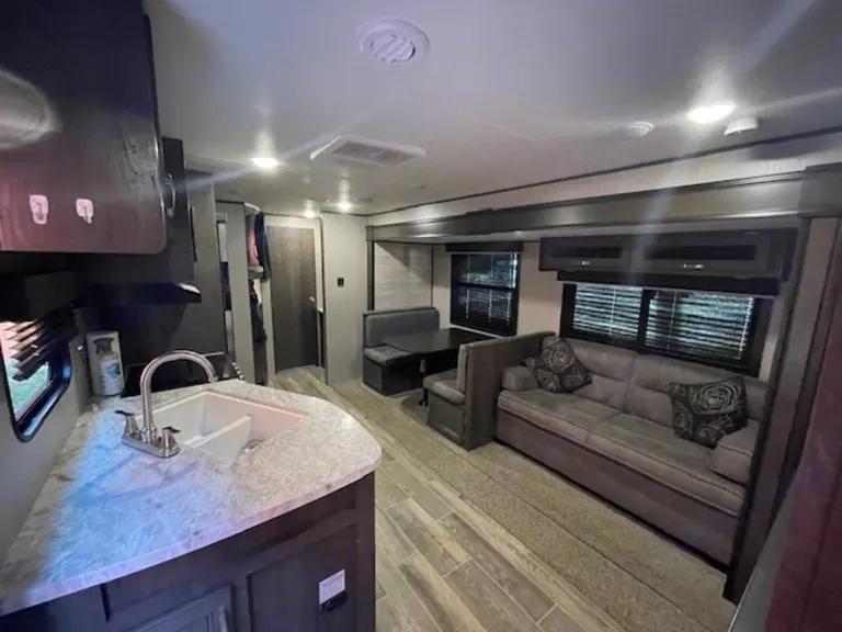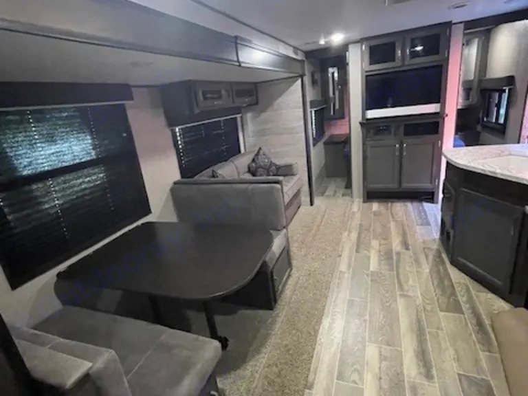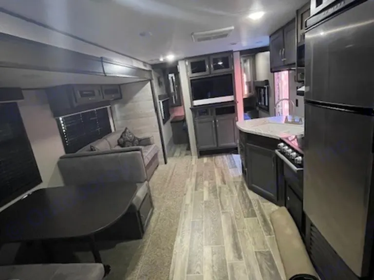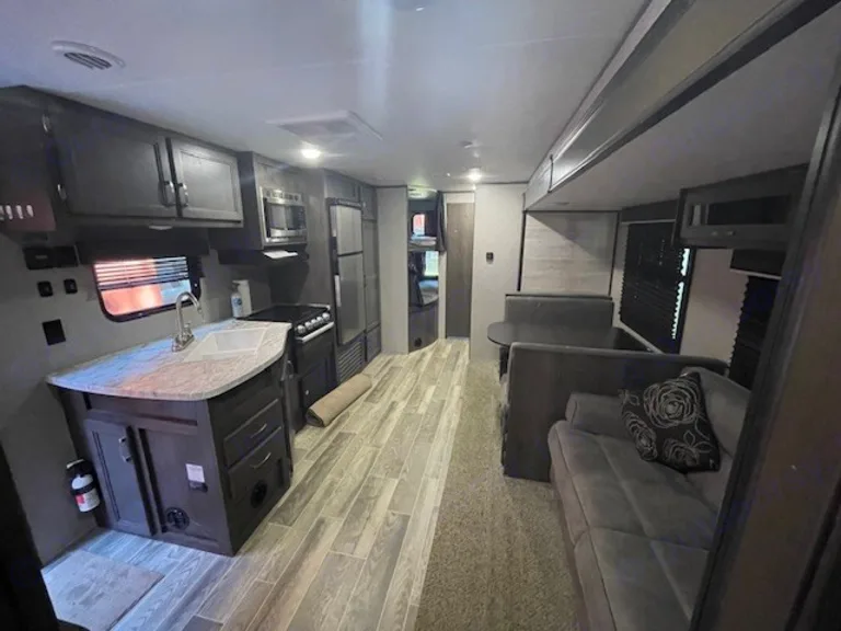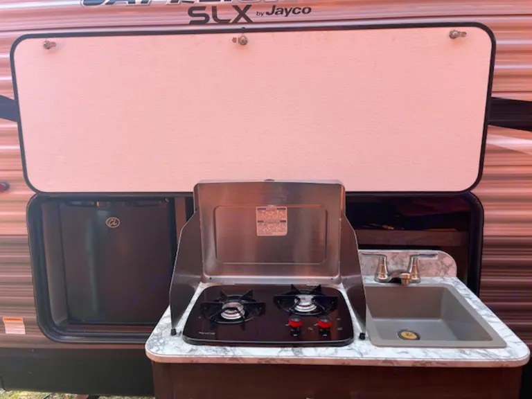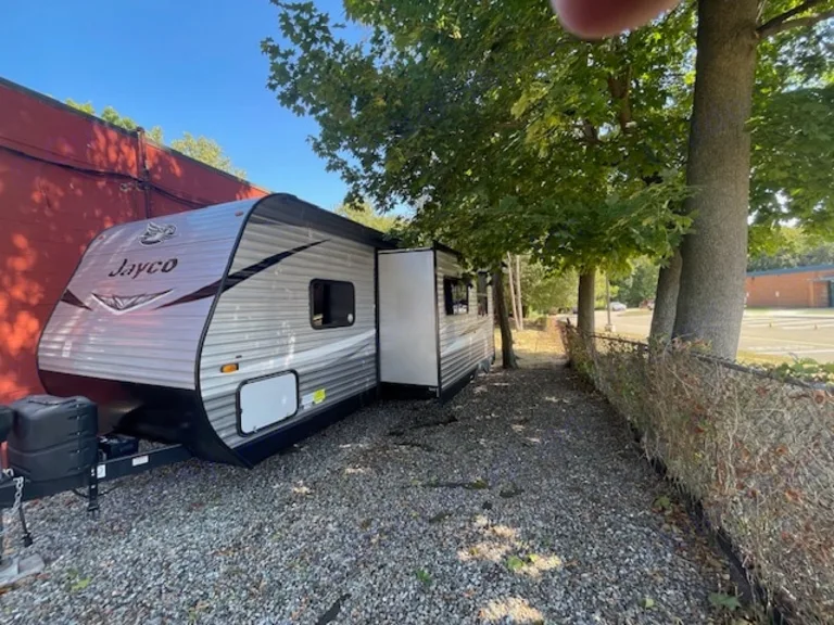 Brand new only used a few times. Beautiful Jayco Bunk House trailer with Queen Sleeper and full size bunks along with dinette sleeping and scissor sofa. Flat Screen TV, Bluetooth Stereo win side and outside speakers, Outside kitchen with cook top, refrigerator and sink for cleaning. Nice size shower/bathtub. Out door shower. LED lights on awning, with speakers on awning. Great set up and will fit in all campgrounds because OAL I