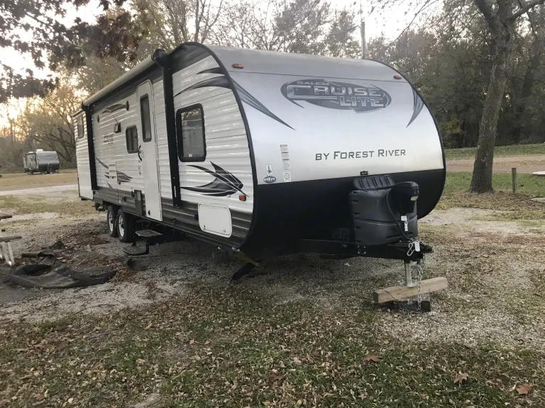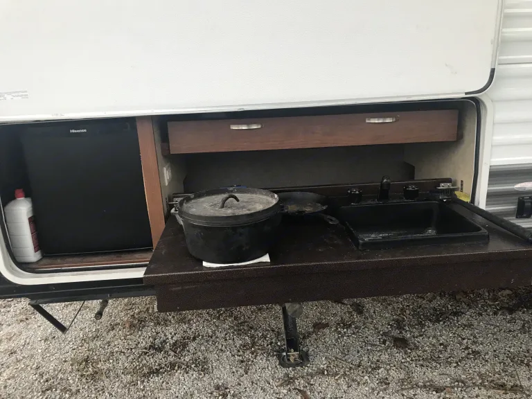 Bunkhouse with 3 beds and a fold down couch, and outdoor kitchen. Features electric jacks and awning.