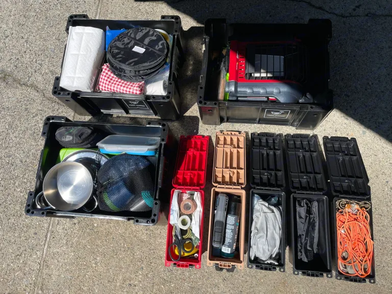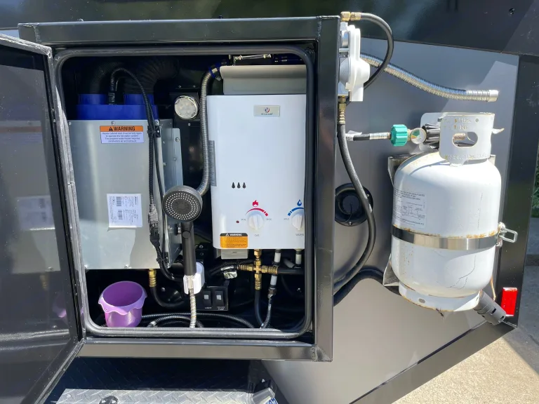 This RV rental interior offers organized storage compartments, a utility control panel, and a carpeted floor, perfect for off-grid travel.. Off Grid Trailers Off Grid Trailers Trailer 2021