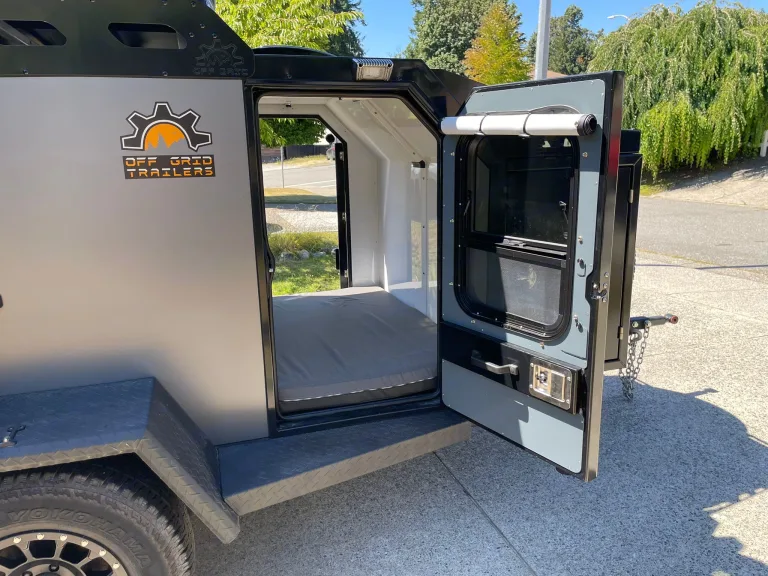 Inside an Off Grid Trailers RV rental: compact, rugged camper with open door showing bed & controls, ready for adventure.. Off Grid Trailers Off Grid Trailers Trailer 2021