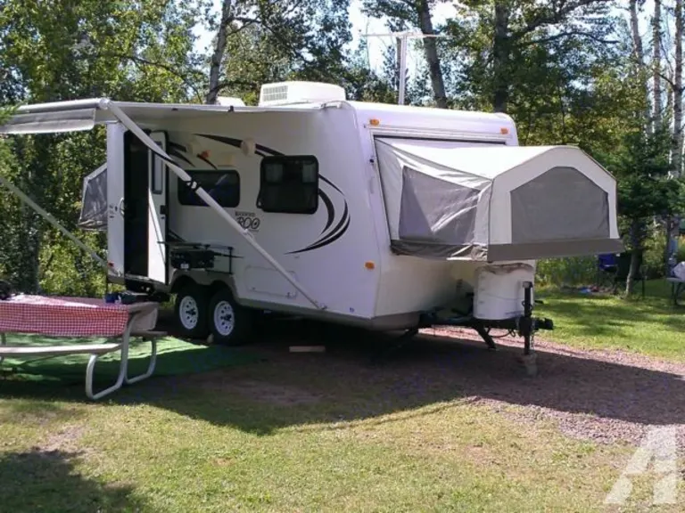 Spacious non-smoking hybrid camper with convenient sleeping for 4, and up to 6 or 7 in a pinch if taking advantage of the fold-down table and couch.Comes fully equipped with just about anything you will need on your camping adventure.Sleeping: 2 queen-sized drop-down tent-end bunks, with heated mattresses for those chilly nights. Dining tables folds-down into double-bed (suitable for a couple children or one adult) and the couch folds flat for one more adult or child.Amenities: Large fridge with freezer, microwave, stove, and oven. Washroom with shower.Camper Inclusions: Dishes, pots and pans, bowls, silverware, some board games. Patio mat, small side table, umbrella, hatchet, picnic table table-clothes. Clothes line and pins.Need to Bring: Food, clothes, towels, sleeping bags and/or blankets/linens.Vehicle should be able to tow 5,000 lbs minimum.* Class III hitch, 7 PIN round wiring & electric brake controller required, weight distribution hitch is available at no cost.