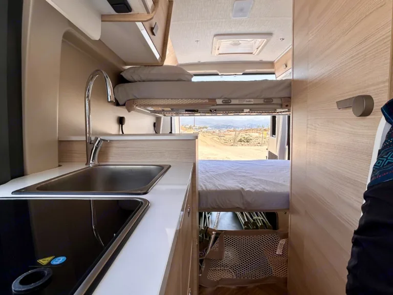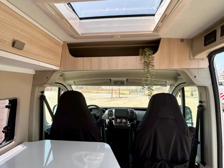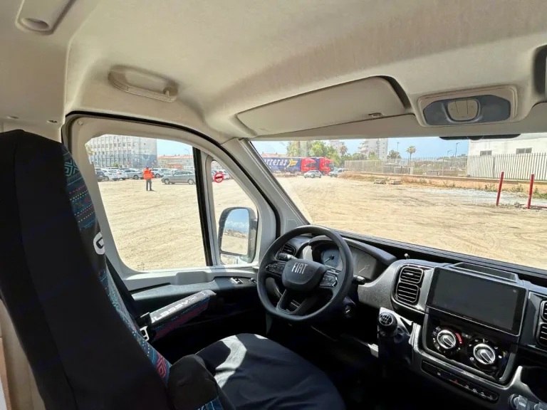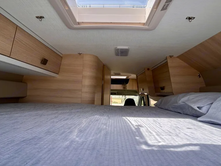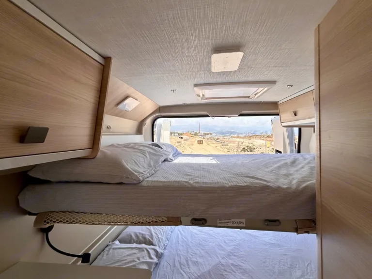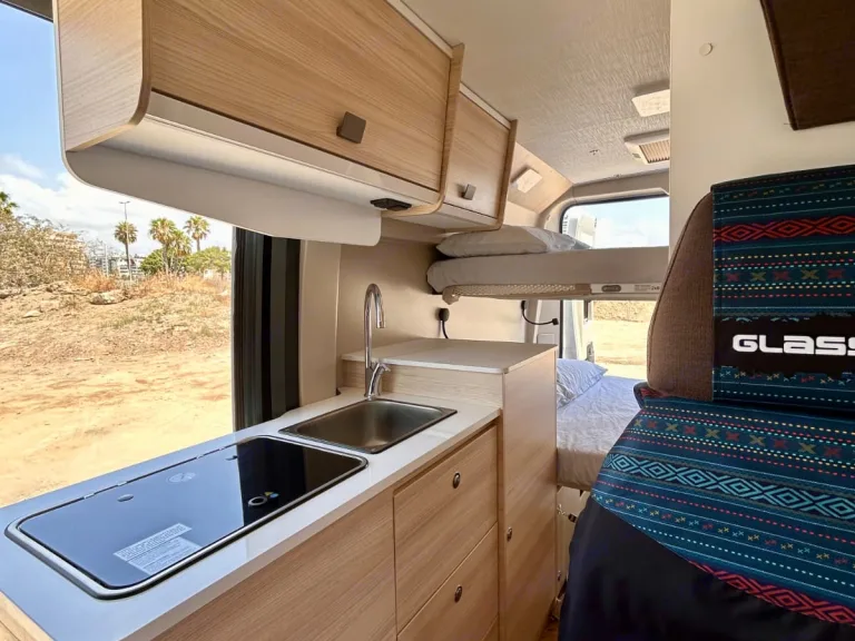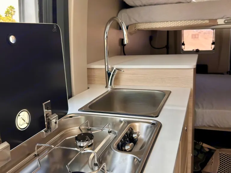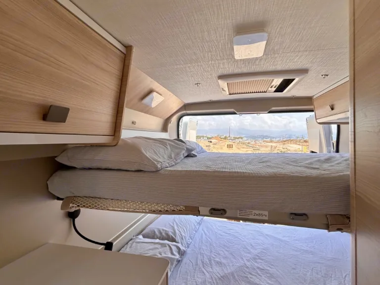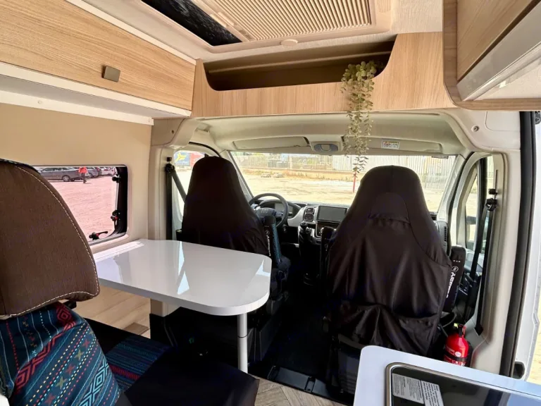 Camper diseñada para ofrecer confort y versatilidad. Motor Fiat 2.2 con 140 cv. Pueden viajar 4 personas y dormir 4 personas ya que dispone de dos camas de matrimonio en litera. Ambas camas son desmontables y ofrecen diferentes opciones, tanto si viajas en pareja como si lo haces en familia o si lo haces solo. Dispone de cocina equipada con 2 hornillos a gas, fregadero y nevera, así como una gran capacidad de almacenaje. El baño completo consta de lavabo, WC químico y ducha con agua caliente. Está equipada con una mesa en la zona de comedor donde pueden comer hasta 4 personas cómodamente gracias a sus asientos delanteros giratorios. La camper dispone de calefacción a gas en la zona de la vivienda. En la zona de la cabina tiene AA/CC y calefacción, pantalla multimedia táctil compatible con Apple Car Play y Android Auto, guantera refrigerada con capacidad para una botella de hasta 1,5 litros, varios conectores USB. Tiene de 3 tomas de enchufe a 220V disponibles cuando la camper está conectada a la red eléctrica, 1 en la zona de cocina, 1 en el baño y otra en la zona de comedor. Las ventanas de la camper y las 2 claraboyas están equipadas con mosquitera y oscurecedores. El acceso a la vivienda por la puerta lateral también dispone de mosquitera y un peldaño eléctrico que facilita la entrada.