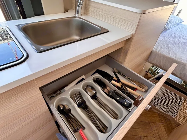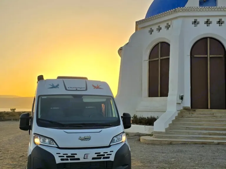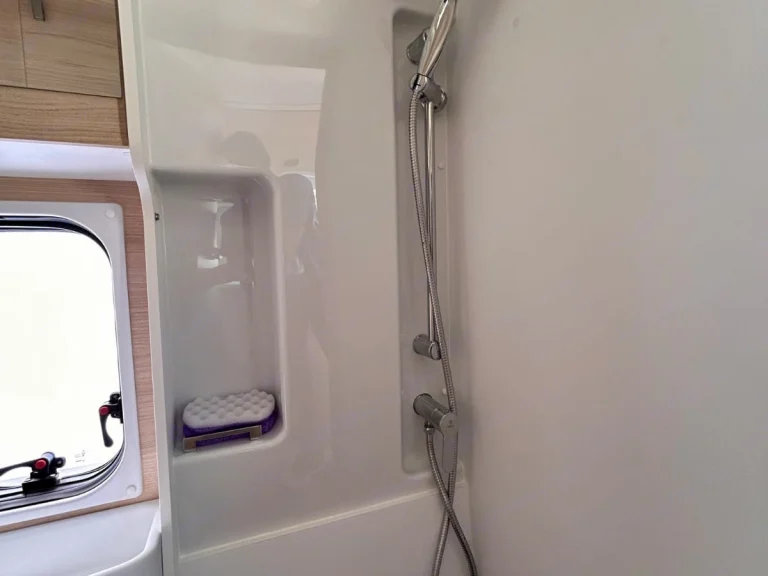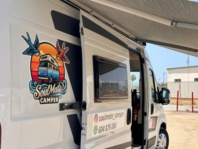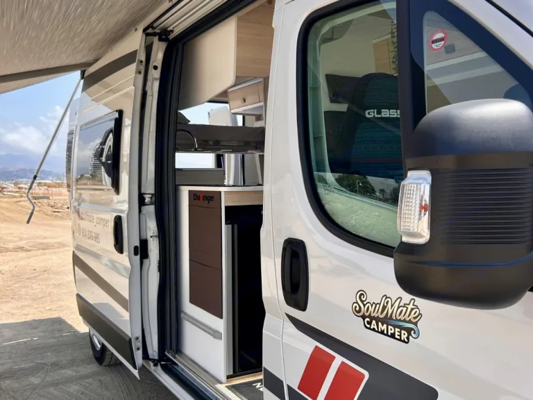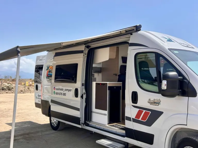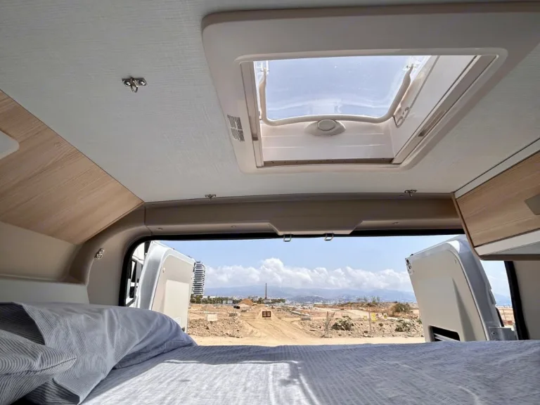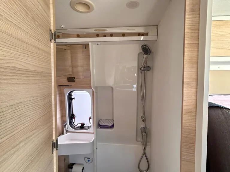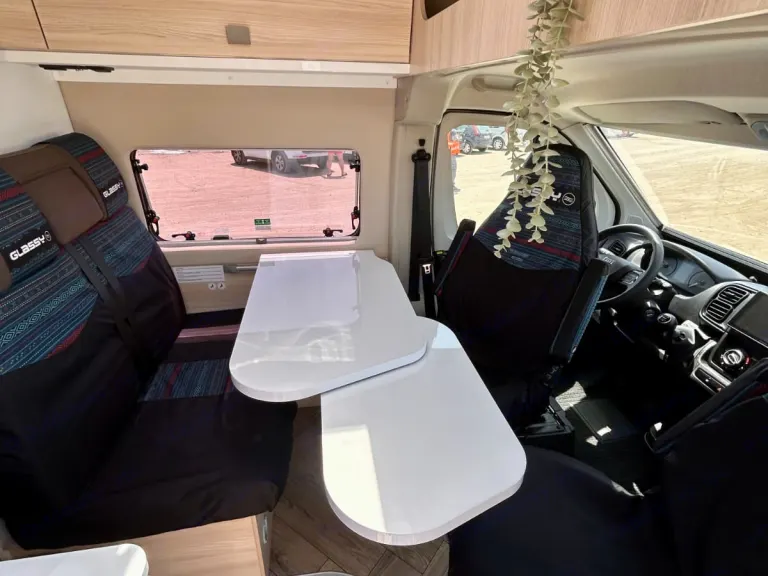 Camper diseñada para ofrecer confort y versatilidad. Motor Fiat 2.2 con 140 cv. Pueden viajar 4 personas y dormir 4 personas ya que dispone de dos camas de matrimonio en litera. Ambas camas son desmontables y ofrecen diferentes opciones, tanto si viajas en pareja como si lo haces en familia o si lo haces solo. Dispone de cocina equipada con 2 hornillos a gas, fregadero y nevera, así como una gran capacidad de almacenaje. El baño completo consta de lavabo, WC químico y ducha con agua caliente. Está equipada con una mesa en la zona de comedor donde pueden comer hasta 4 personas cómodamente gracias a sus asientos delanteros giratorios. La camper dispone de calefacción a gas en la zona de la vivienda. En la zona de la cabina tiene AA/CC y calefacción, pantalla multimedia táctil compatible con Apple Car Play y Android Auto, guantera refrigerada con capacidad para una botella de hasta 1,5 litros, varios conectores USB. Tiene de 3 tomas de enchufe a 220V disponibles cuando la camper está conectada a la red eléctrica, 1 en la zona de cocina, 1 en el baño y otra en la zona de comedor. Las ventanas de la camper y las 2 claraboyas están equipadas con mosquitera y oscurecedores. El acceso a la vivienda por la puerta lateral también dispone de mosquitera y un peldaño eléctrico que facilita la entrada.