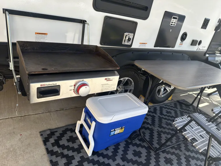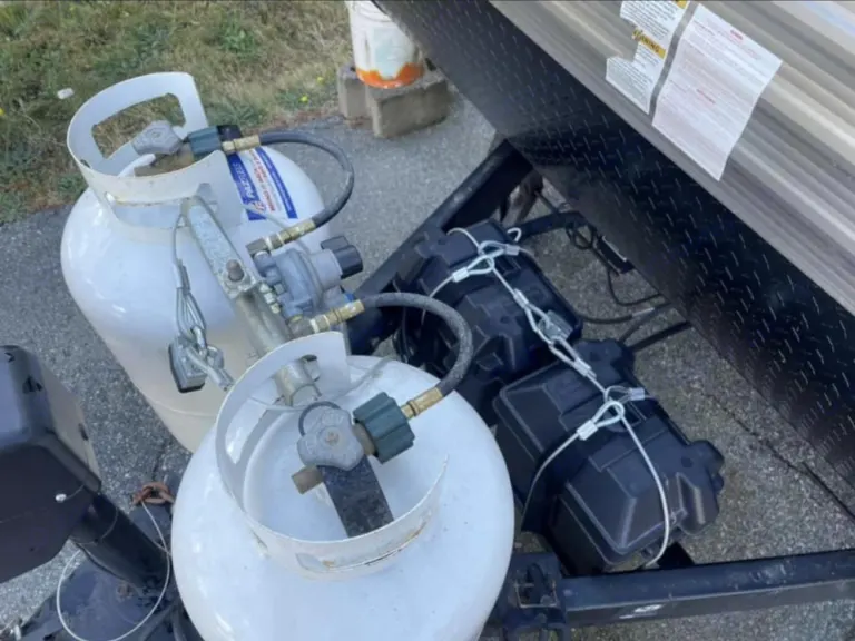 AC/HeaterExterior Amenities:Outside flat-top grill with quick connect to the propane. Outside shower. Outside clasp to connect TV. Outside bluetooth speakers. Outside electrical outlets to plug in your devices. Electric awning with LED lighting.2-propane, 2-batteries.What's included• Bedding: Comforter, sheets, pillows.