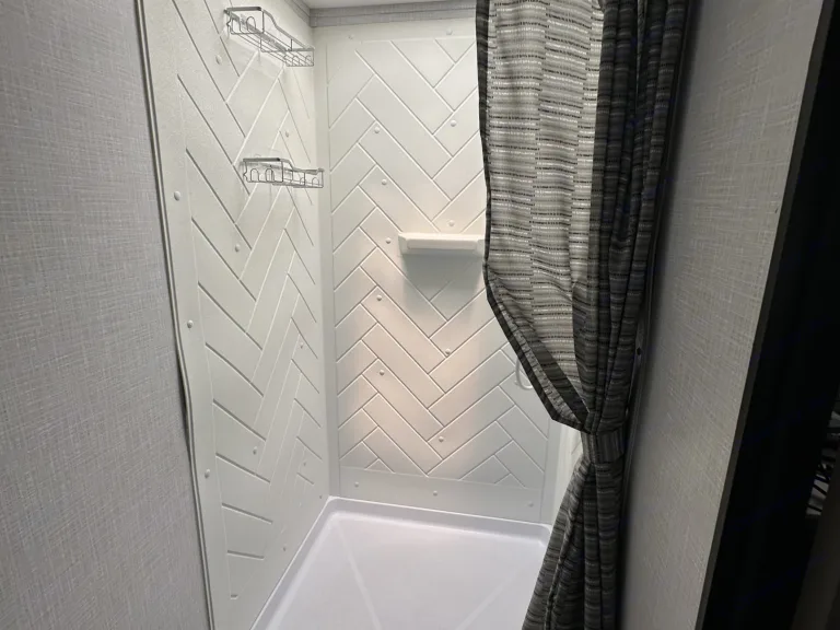 Rear-facing bathroom with shower, foot-flush toilet, closet with two pull out drawers, skylight for natural lighting, and hot/cold water powered by electricity or propane.Interior Amenities: