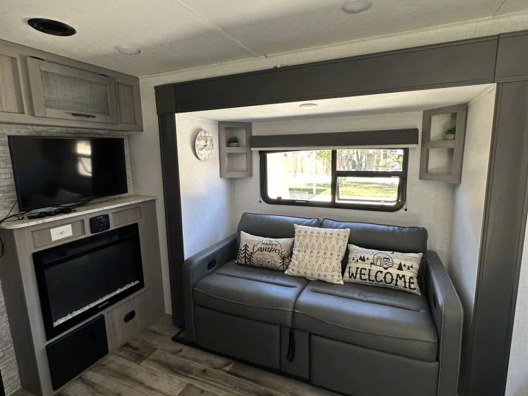 Slide out. TV/DVD, electric fireplace, radio, bluetooth speakers for interior & exterior.Climate Control: