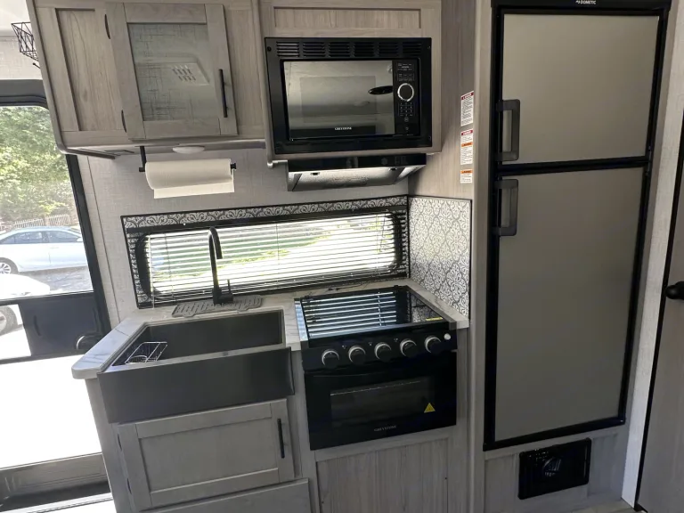 Accommodates up to three people with a walk-around Queen bed and a fold-out recliner that sleeps one adult or child.Kitchen Amenities:Equipped with a 3-burner stove, oven, microwave, 12-v refrigerator, stainless steel sink (hot/cold water).Bathroom Amenities: