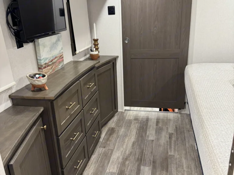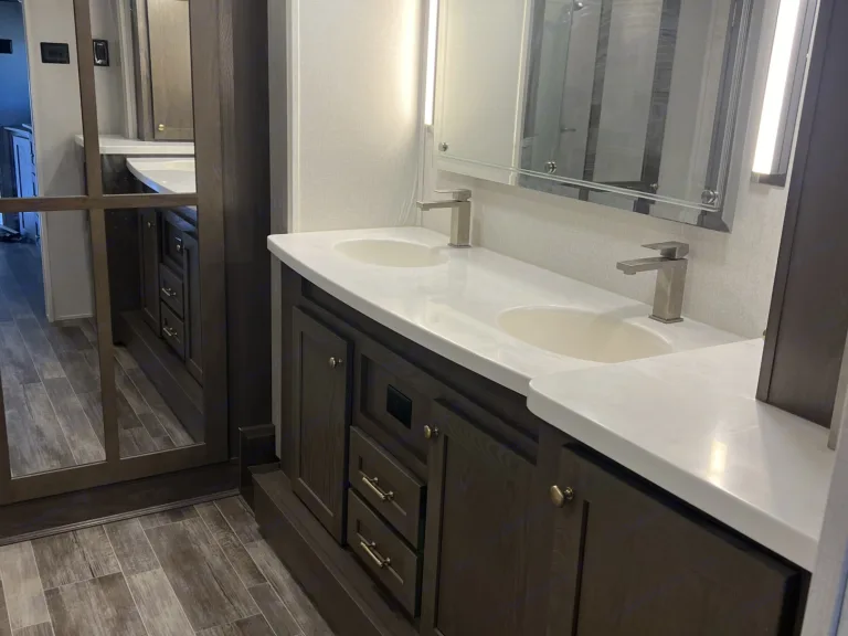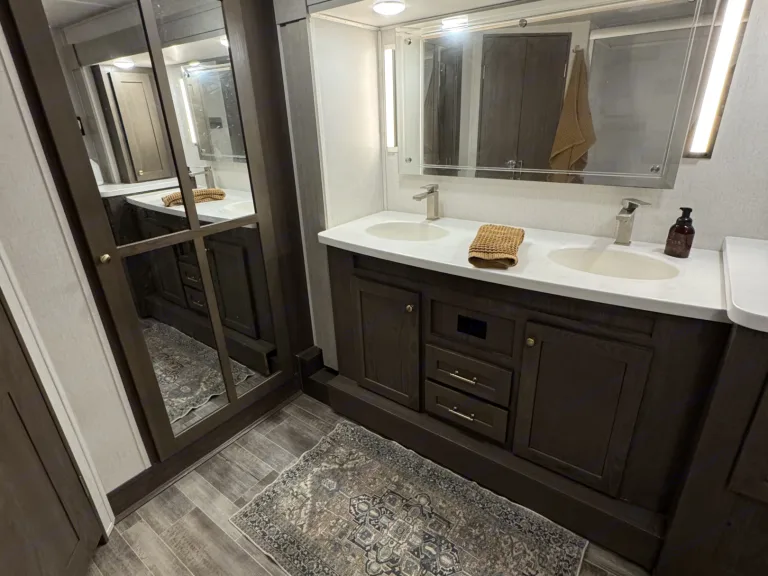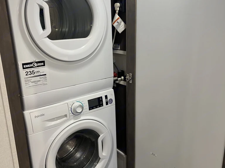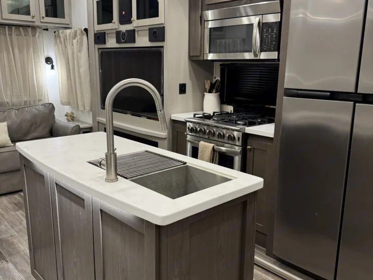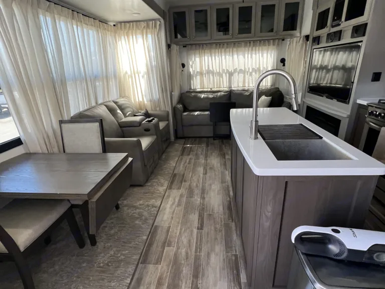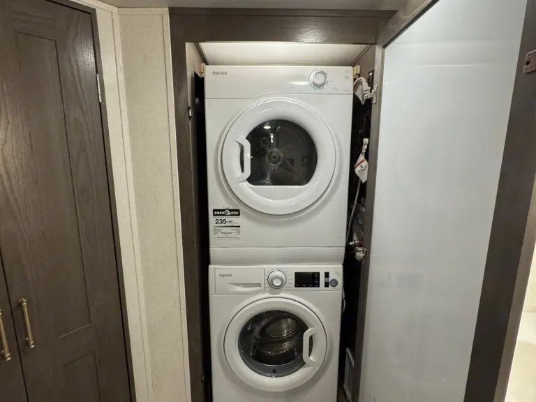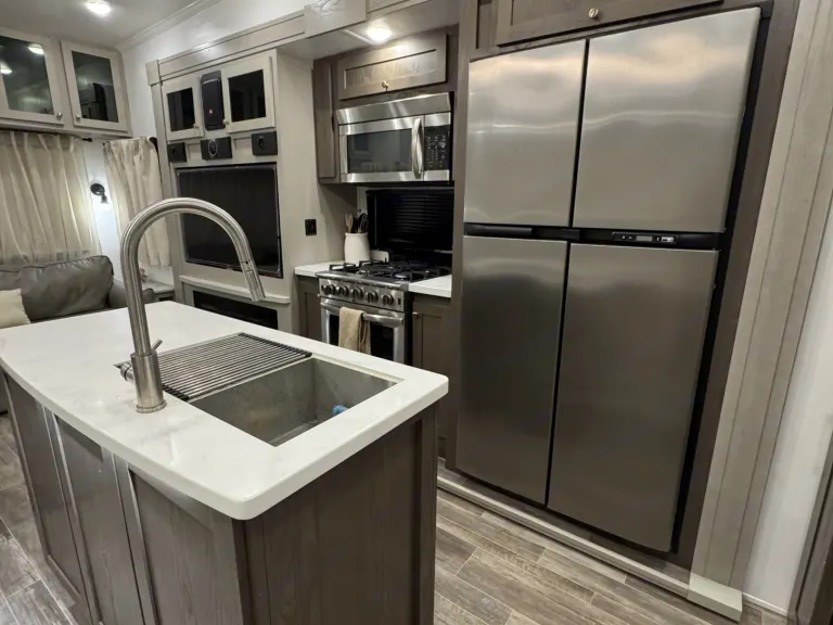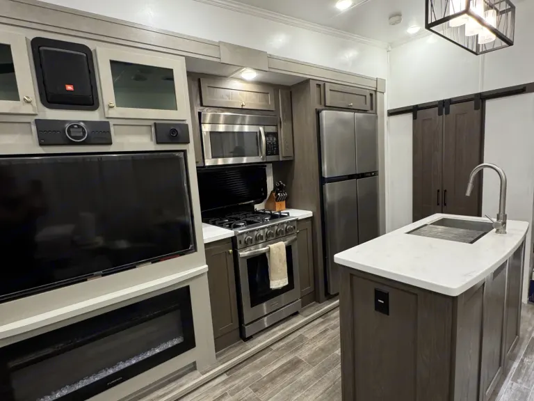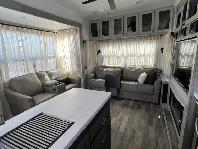 This is a couples dream fifth wheel with a master suite that offers a king bed slide out, an entertainment center and storage, plus a sliding door into the large front bathroom complete with a two sink vanity, a seated shower, and a walk-in closet. There is a washer & dryer . You will enjoy the main living and kitchen area with dual opposing slides, a kitchen island, You will also find residential appliances, and lots of seating from the split tri-fold, the power theater seats and the free standing table with chairs.Other things to noteNo Smoking!