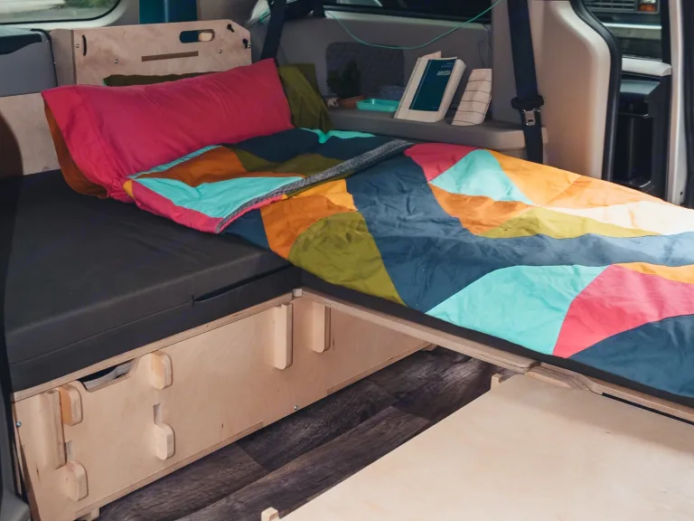 Grâce à cette bâche spécialement conçue pour le hayon de la minivan, tu seras doublement protégé.e pour cuisiner en cas de pluie, en plus d'avoir une ouverture avec moustiquaire à l'arrière de ta minivan.