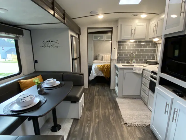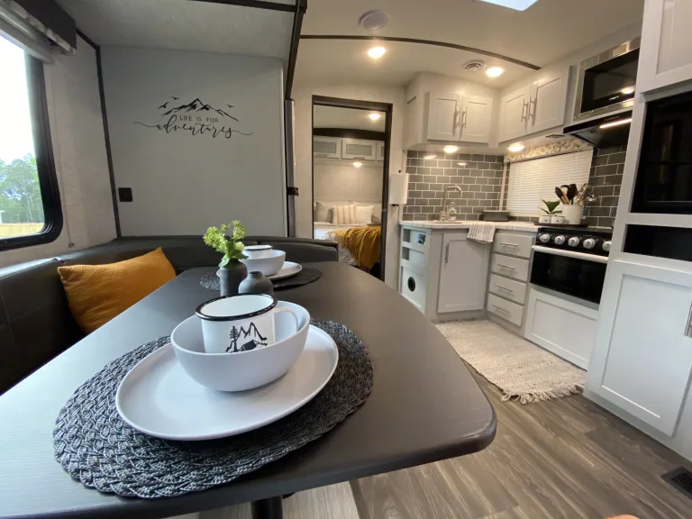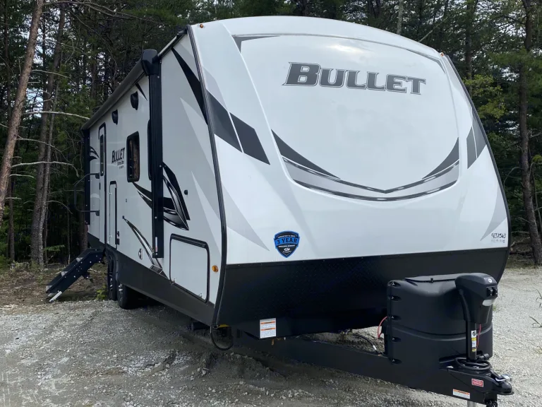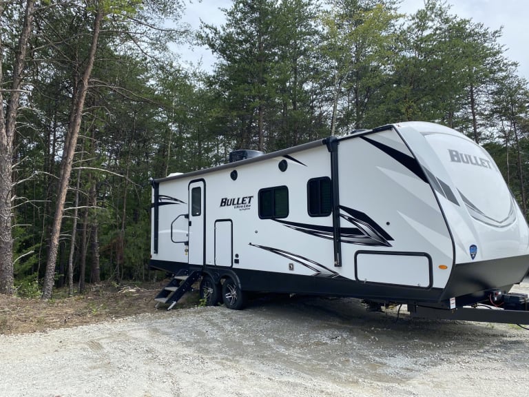 A brand New Bullet Travel Trailer for your next Glamping Trip!Beautifully set up and loaded with everything you might need, just bring your food.Gorgeous interior.It has a queen bed, full size bunks and the dining area folds down to a full size bed.Comes with and oven, microwave, heater, A/C, full refrigerator, small refrigerator outside, stove outside, full kitchen, full bathroom, lots of storage space.Includes dishes, gorgeous coffee mugs, pots, pan, tea kettle, bowls, silverware, utensils, knives and cutting boards, kitchen and bath towels, silverware, spice rack, will include toilet paper and one paper towel roll, first aid and much more...ALL Bedding IS AN Extra Charge. Please inquire for how many ppl you would need bedding for at the time of reservation. What's includedIncludes dishes, gorgeous coffee mugs, pots, pan, tea kettle, bowls, silverware, utensils, knives and cutting boards, kitchen and bath towels, spice rack, will include toilet paper and one paper towel roll, first aid and much more will be added soon....RecommendationsGlamping, Camping, a trip to celebrate any important events in your family!Other things to noteAbsolutely no smoking inside!Absolutely no cleaning fish inside of any kind!No sand, as it is super hard to clean.Excess pet hair will be charged an additional cleaning fee of $150