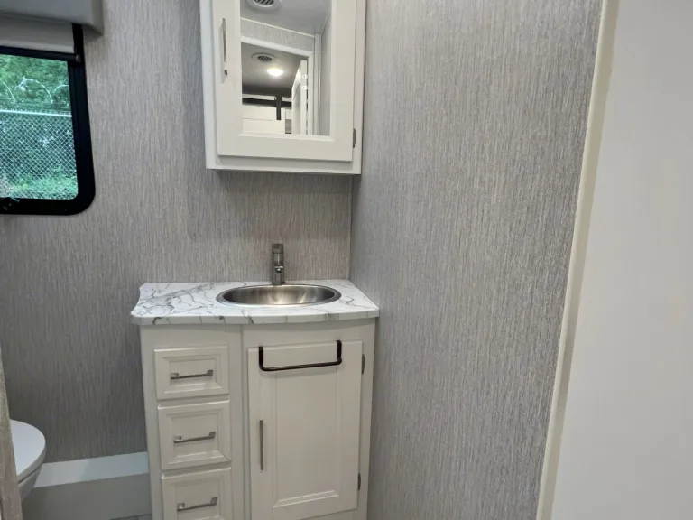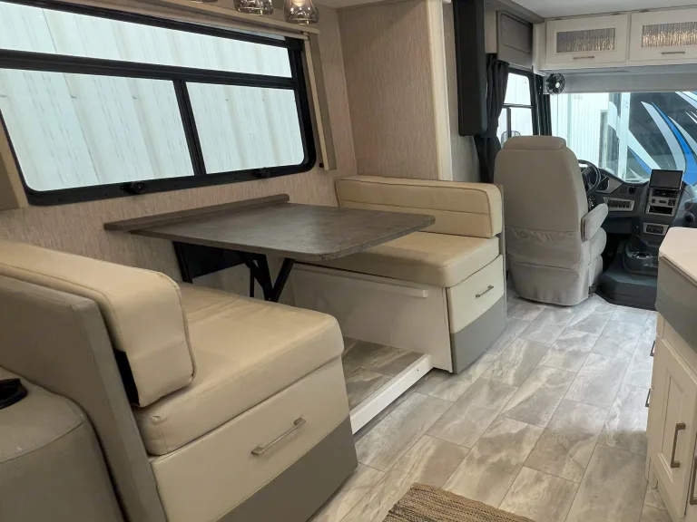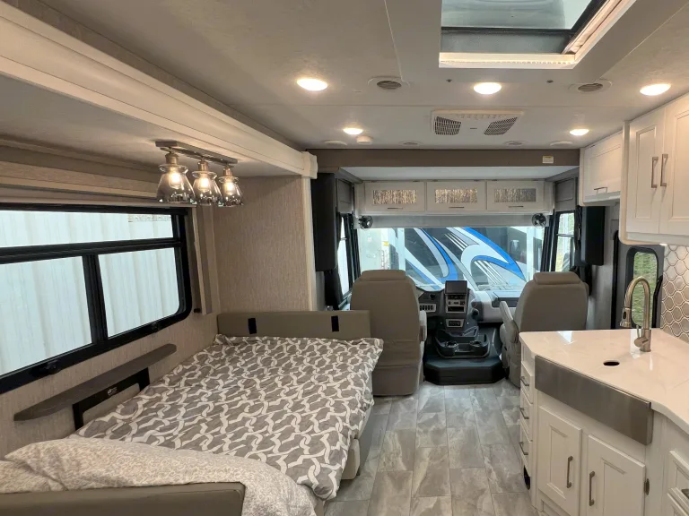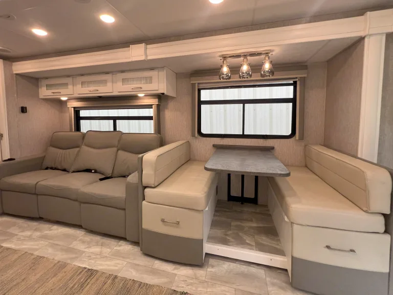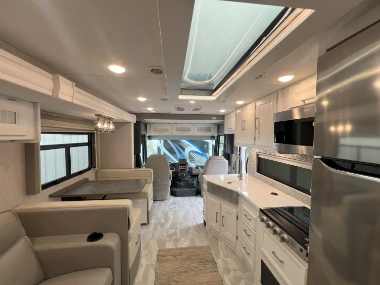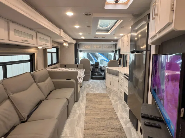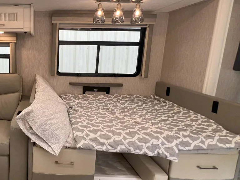 This newly added stunning Class A, sleeping 9 is only $299 a night. The Encore offers the look, feel and drivability of a premium diesel machine—all without the diesel price tag. In master bedroom you’ll find a king mattress with an elegant designer headboard, spacious wardrobe and LED TV. Lift the bed to reveal massive storage underneath. This area provides extra seating, shoe rack and pull-out drawers. The master bathroom features a glass shower door and skylight, with stainless steel and porcelain touches making them easy to clean. The whole family has room with the dinette converting to a full-size bed, a set of bunk beds, and a cozy full-size loft. You won't want to go outside with the relaxing, heated and massaging couch and LED TV over the fireplace. Cooking will be done in elegance with stainless steel kitchen and marble tops. You have all the convivences of home in the full-size refrigerator, 3 burner stove/oven, microwave, and double sink. Let’s not forget the 2nd bathroom off the hallway with cabinet space galore. When you are ready for the great outdoors, you have a large awning to relax under and watch your outside TV.