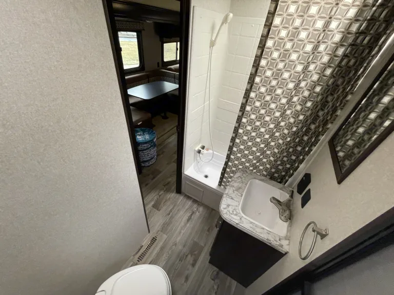 • Sleeping for the whole crew — Queen bed in a private front bedroom, a rear bunkhouse (3 bunks in many units), a jack-knife sofa + U-shaped dinette that convert into beds. Sleeps around 10 people comfortably.