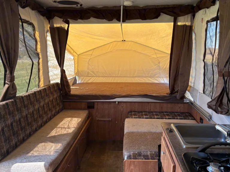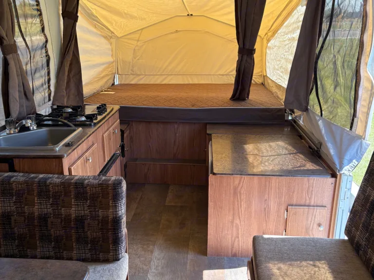 Family fun awaits with this clean light weight tent trailer with RV Queen and RV King beds that will sleep 2 adults each along with fold out dinette and couch beds that will sleep 1-2 kids each depending on age and size. Trailer has an indoor shower and cassette toilet as well as a cooktop and sink and an out door grill. Upfront there is open storage rack for bulky items. Set up is a breeze with an electric cable system to raise and lower the roof. Leveling jacks are provided with pads to land the feet on, pots, pans and plastic forks, knives and spoons along with paper plates and cups will be provided. Propane tanks will be full and ready and batteries will be fully charged. for an extra rental fee we will provide a yamaha 2000 watt generator to recharge the bateries if needed and it can also run the lights and water pump if desired. Overall this is an easy unit to set up and take down and pulls very nicely with smaller SUVs as long as your SUV can haul 3000lbs with a tongue weight of under 400lbs. We will provide sheets for the bed matresses but the fold out beds will require sleeping bags. Other things to noteNo smoking inside the trailer please.