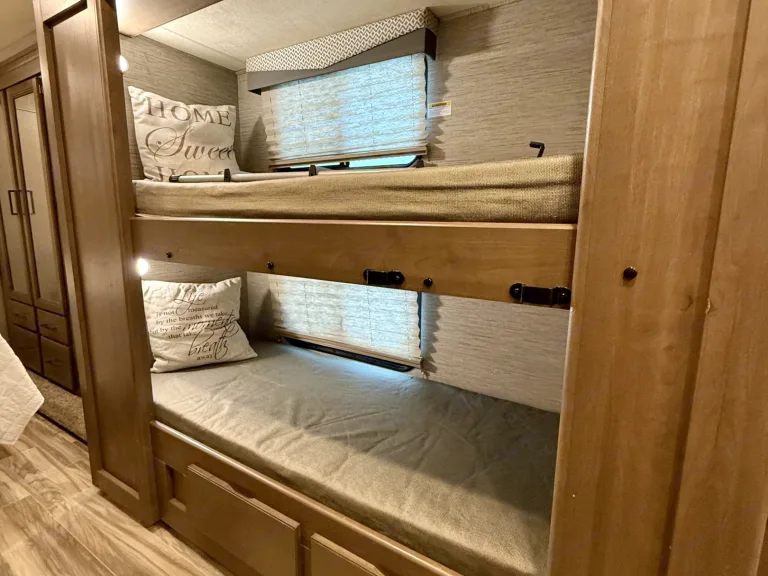Comfortable Sleep Space – Queen bed in a private rear bedroom, plus three bunk beds (cab‑over bunk and two built‑in bunks), along with a jack‑knife sofa and dream dinette that convert to more sleeping areas